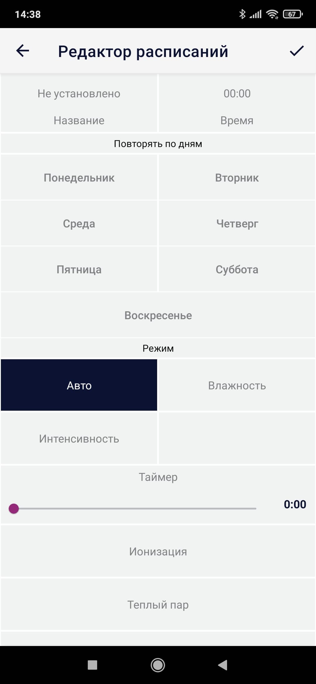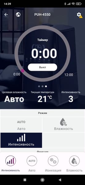 Главный экран приложения представляет собой своеобразный пульт управления, состоящий из трех экранов. На первом из них можно установить целевую влажность, на втором — скорость увлажнения, а третий экран отведен под таймер автоматического отключения.