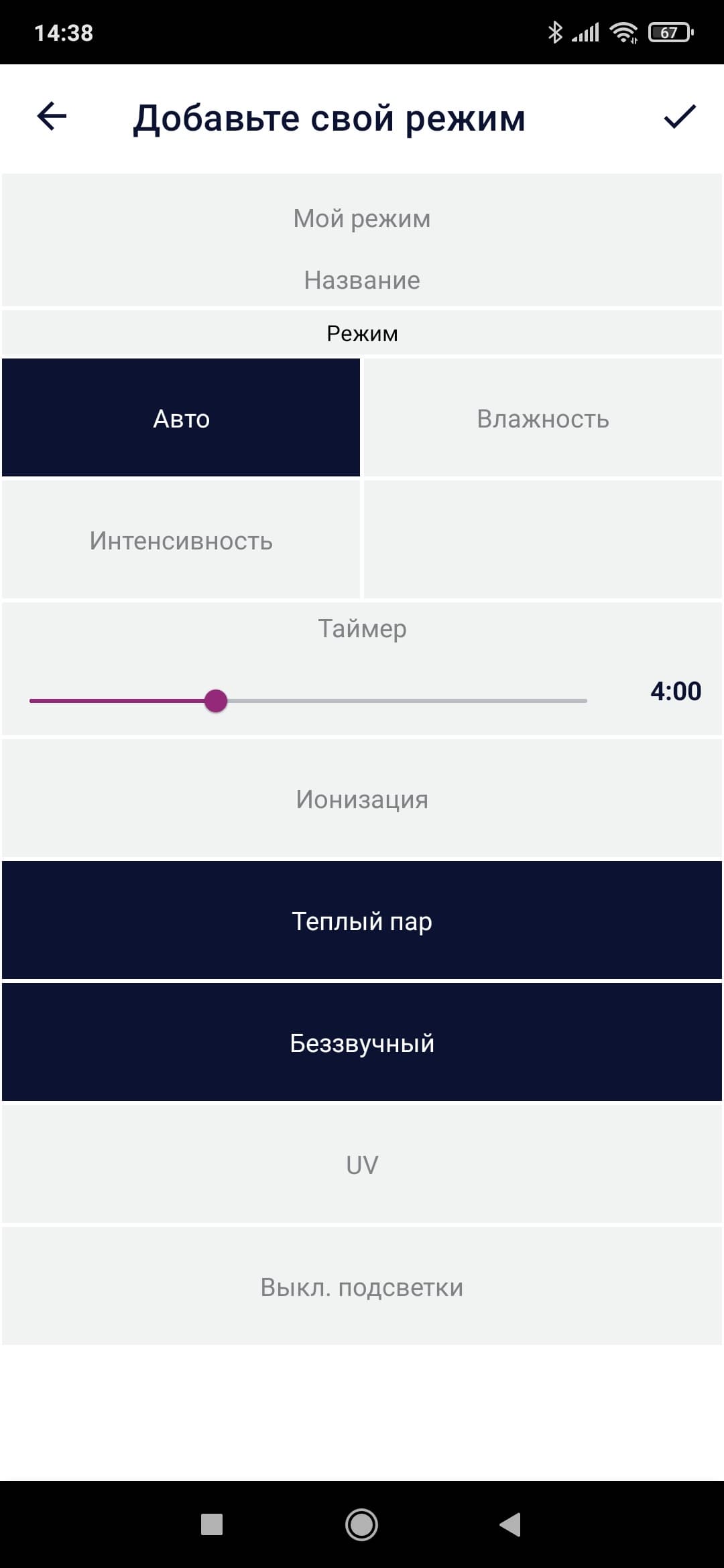 Под кругом находится информация о выбранном режиме, а рядом — температура и выбранная интенсивность увлажнения.