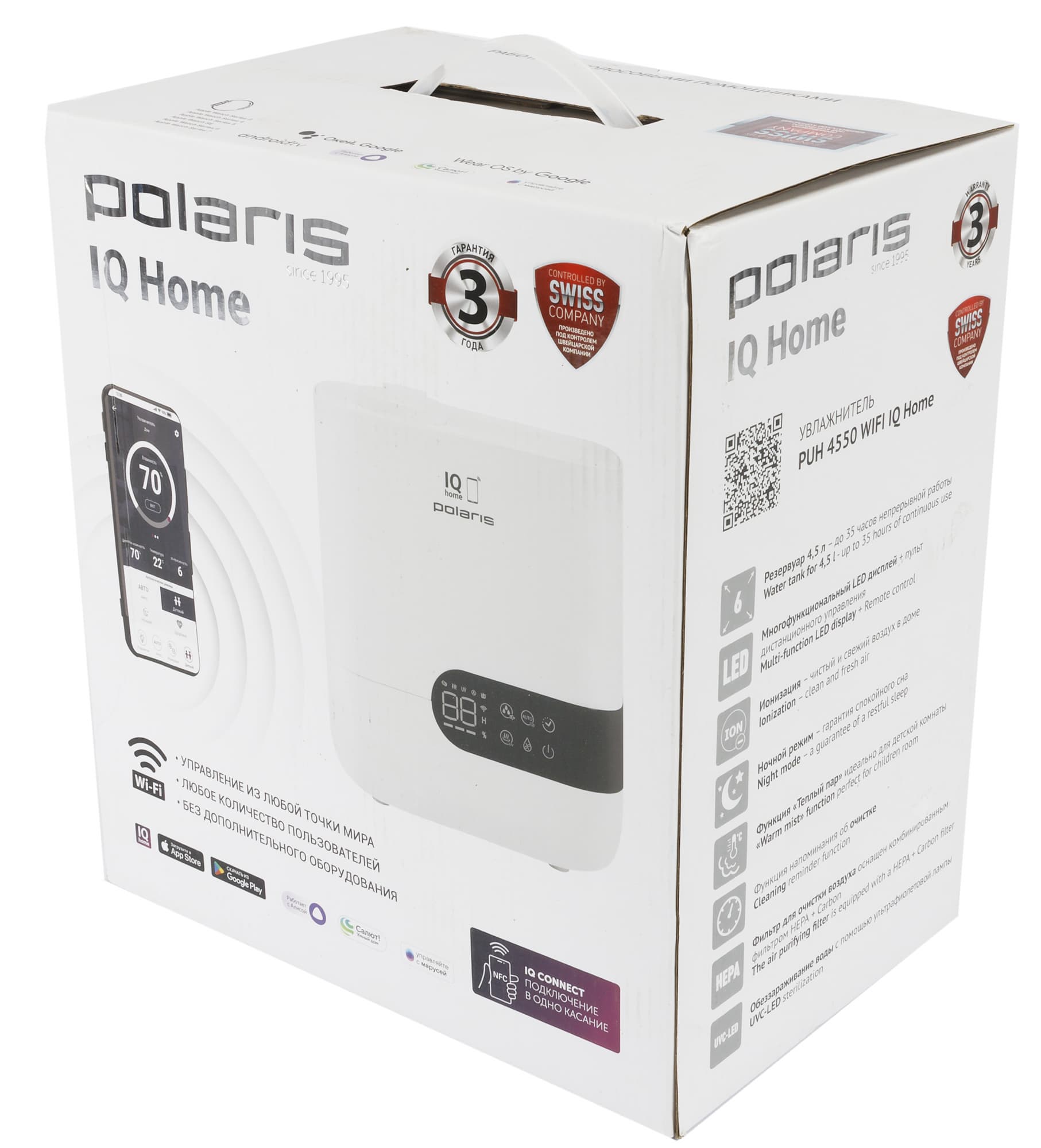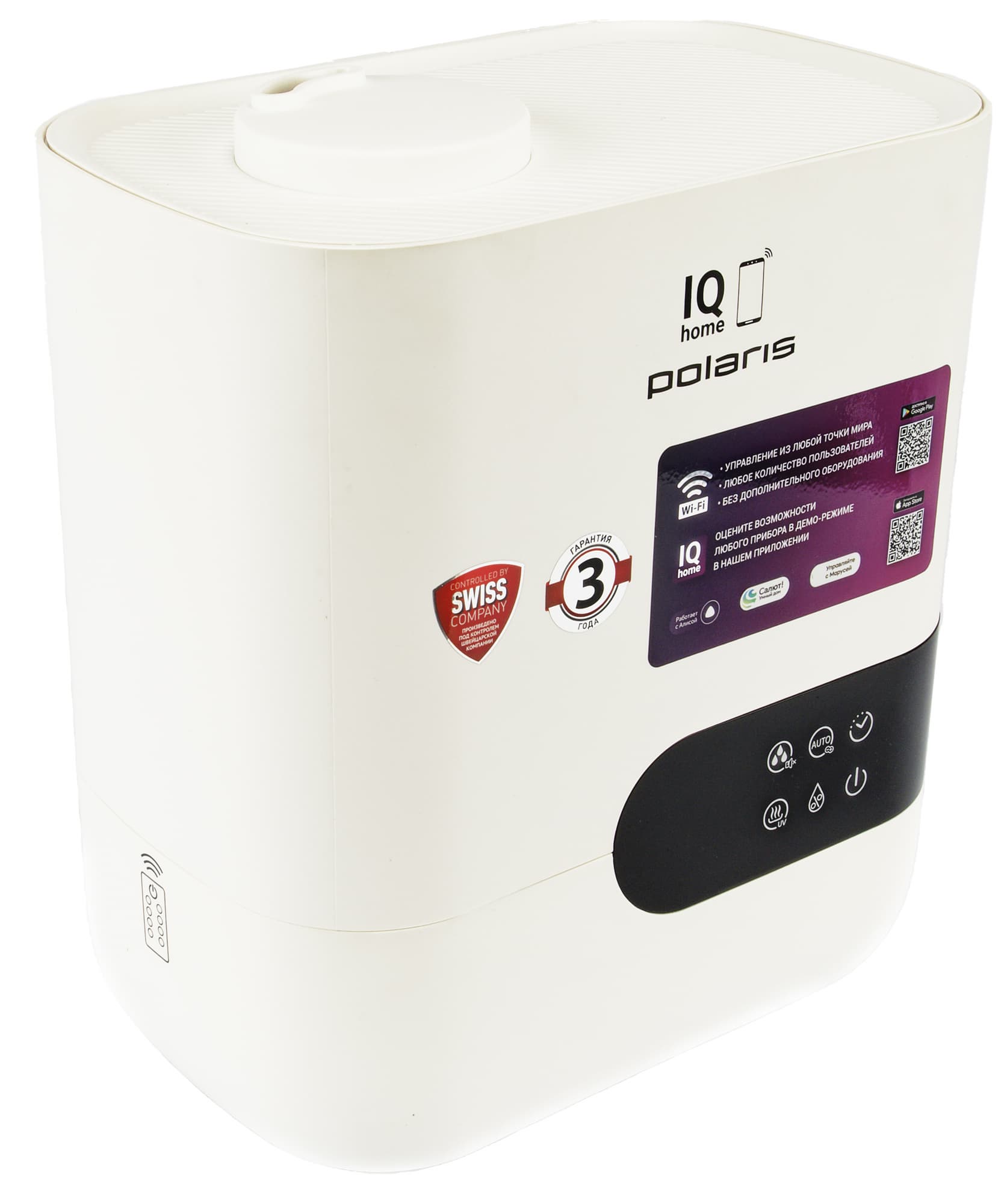 Внимание также привлекают плашки с информацией о швейцарском контроле производства и трехлетней гарантии. Помимо этого на упаковке есть QR-код, позволяющий скачивать фирменное приложение для управления прибором.