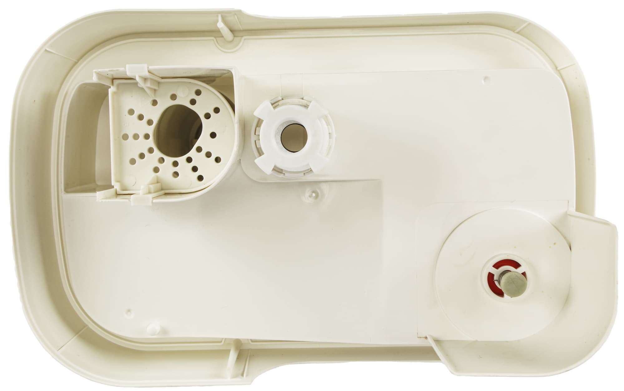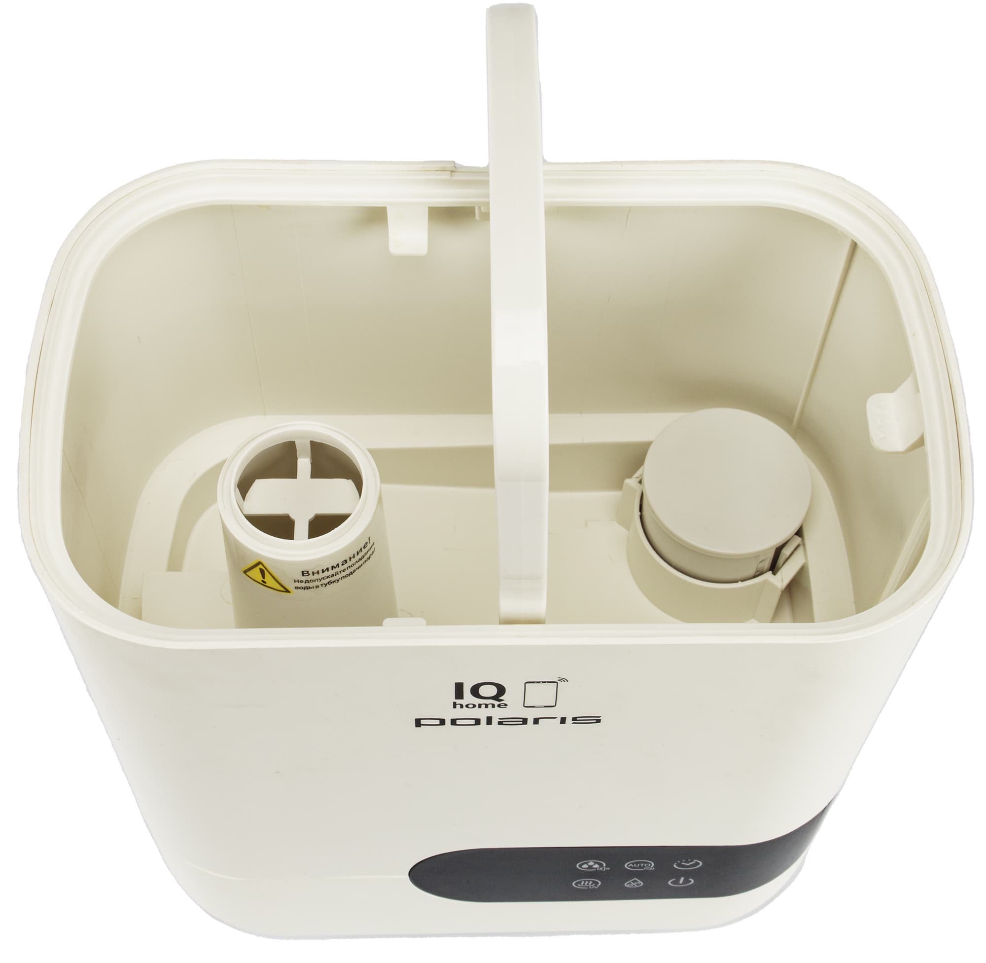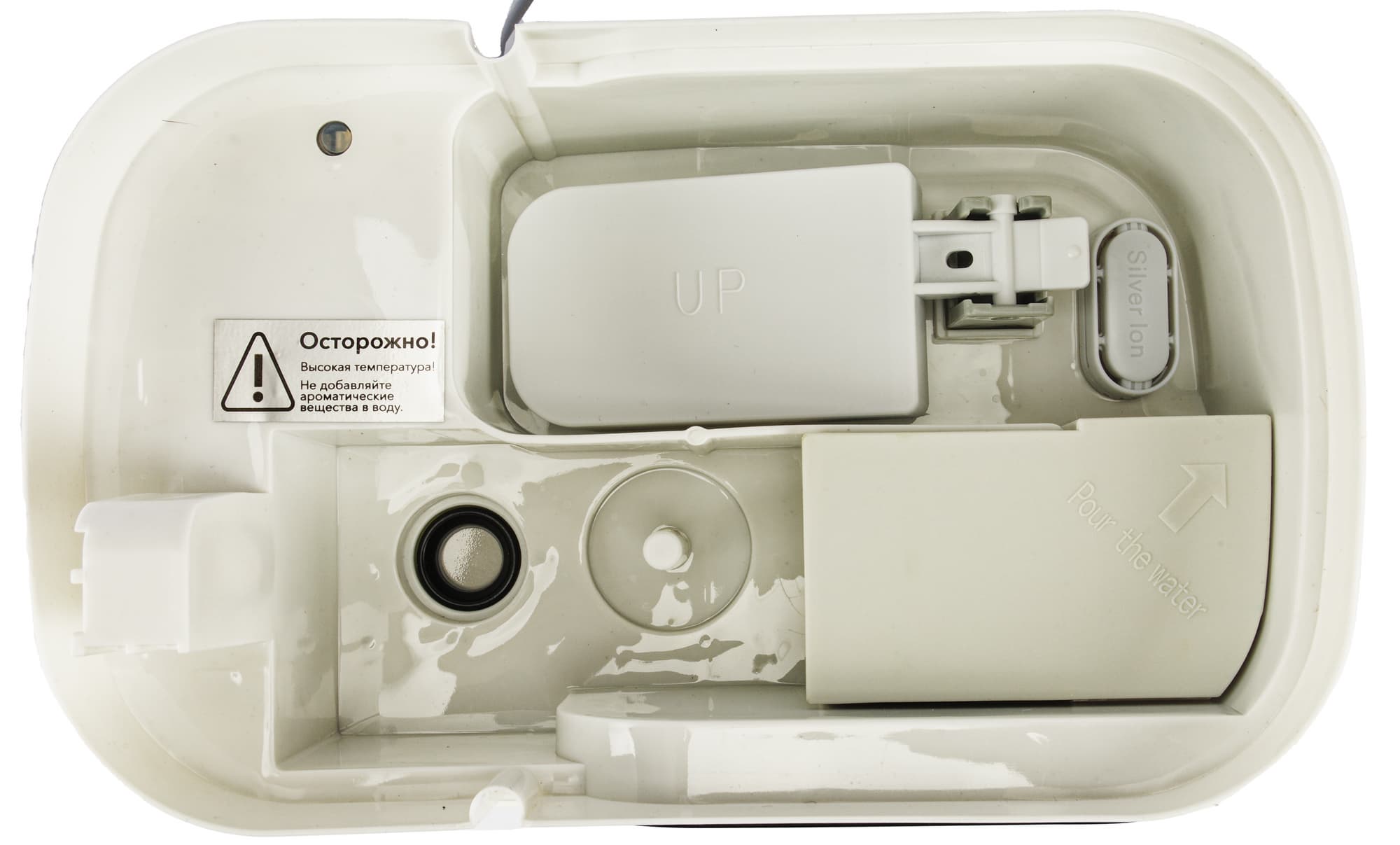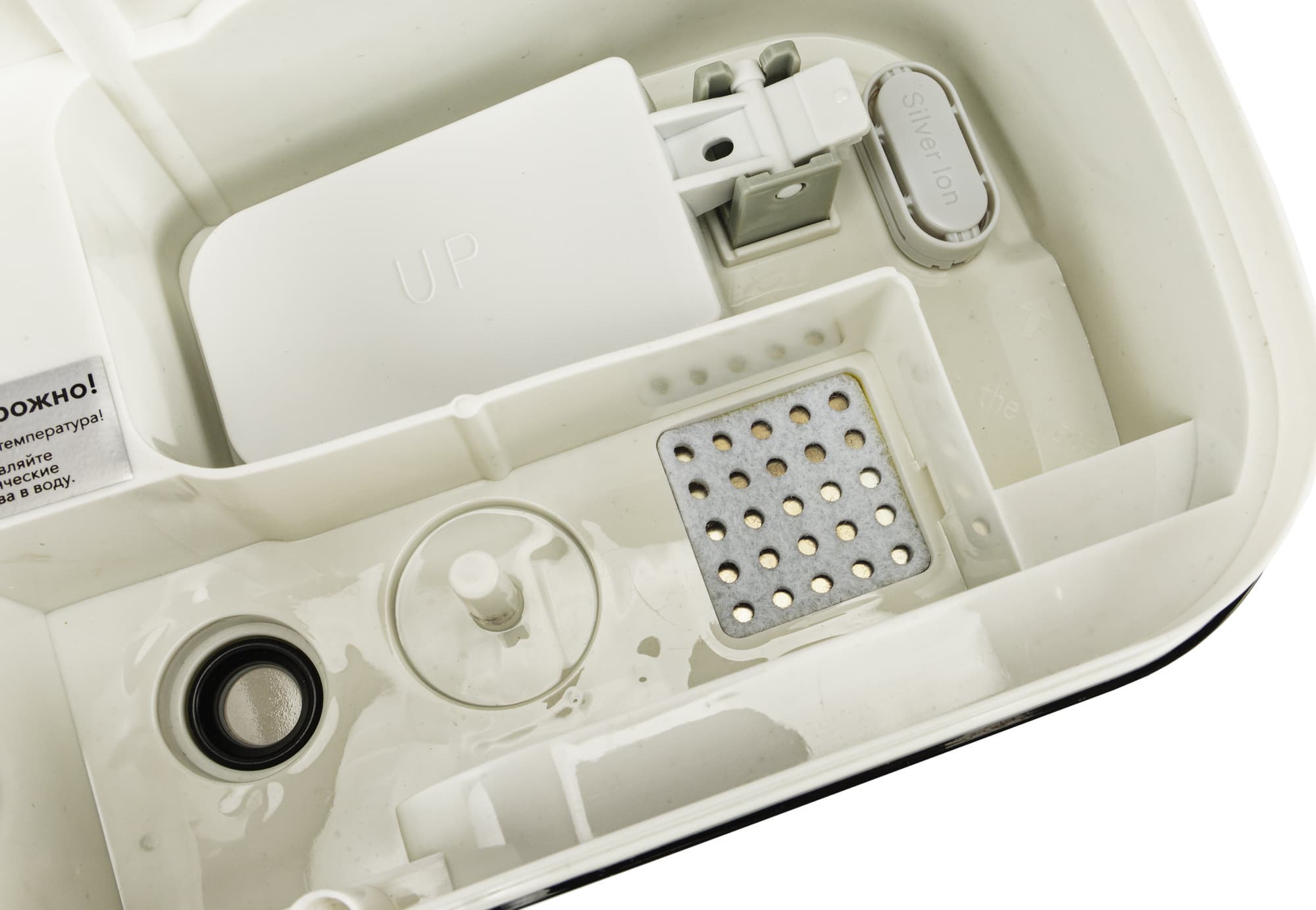 Под бачком расположена рабочая емкость увлажнителя, в том числе: мембрана ультразвукового излучателя, воздухозаборник, блок ионизатора и поплавок, сигнализирующий о низком уровне воды в устройстве.
