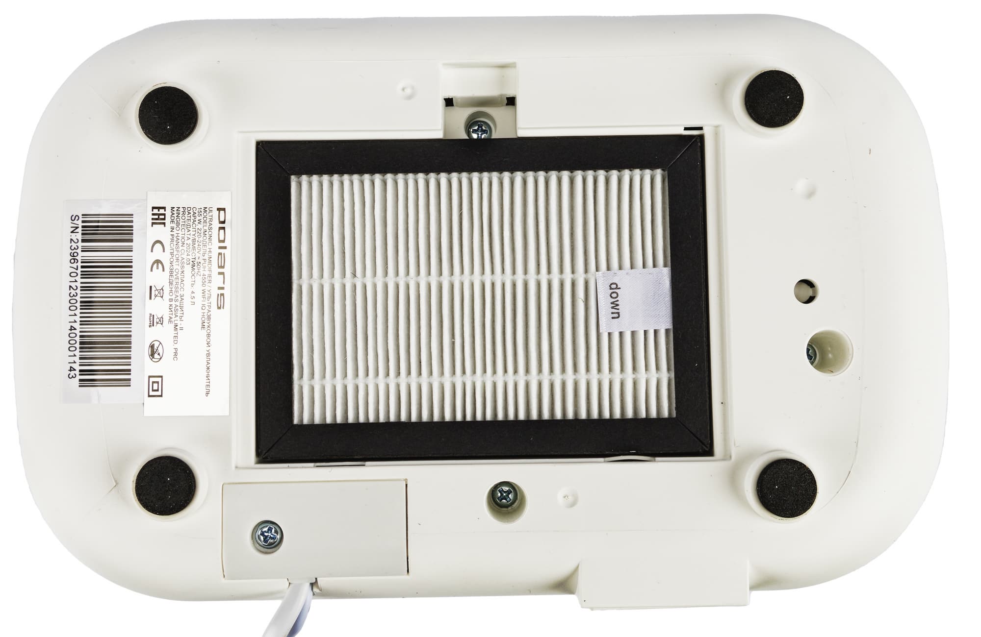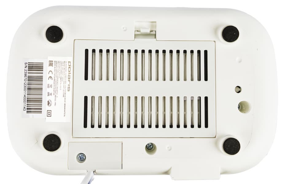 На дне прибора размещены четыре круглых ножки с прорезиненными накладками, обеспечивающими хорошее сцепление с любой гладкой поверхностью, а также шильдик с названием производителя, модели, техническими характеристиками, информацией о стране-производителе и серийным номером.