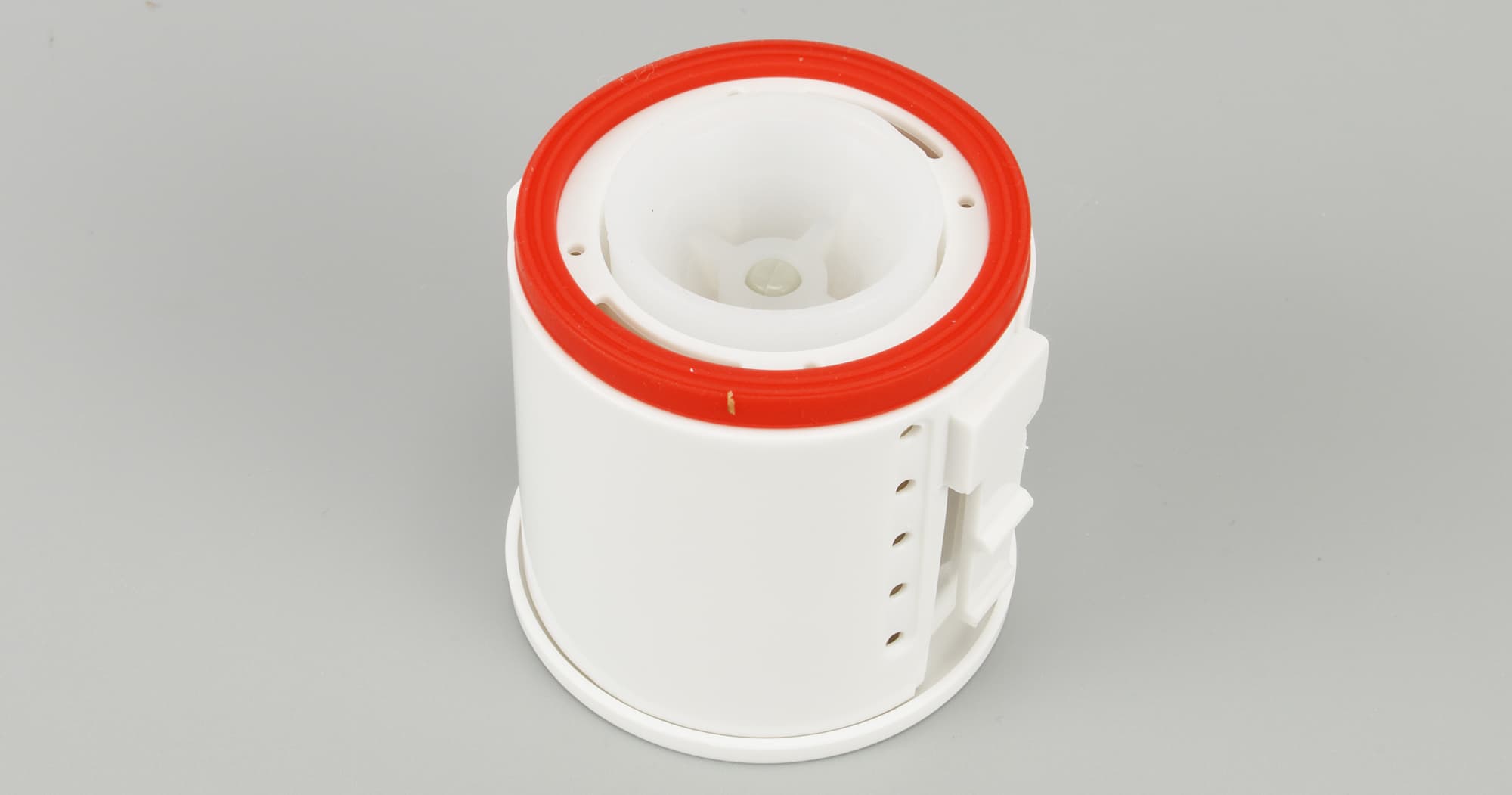 На дне размещается клапан подачи воды в рабочую емкость устройства, совмещенный со съемным фильтром, наполненным керамическими шариками.
