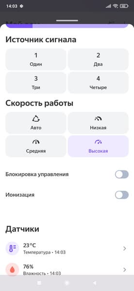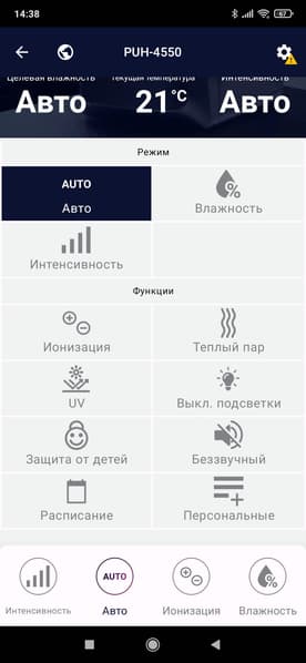 Тут можно изменить целевую влажность, выбрать «скорость работы» (т. е. интенсивность увлажнения), заблокировать панель управления прибора, а также включить либо отключить ионизацию.
