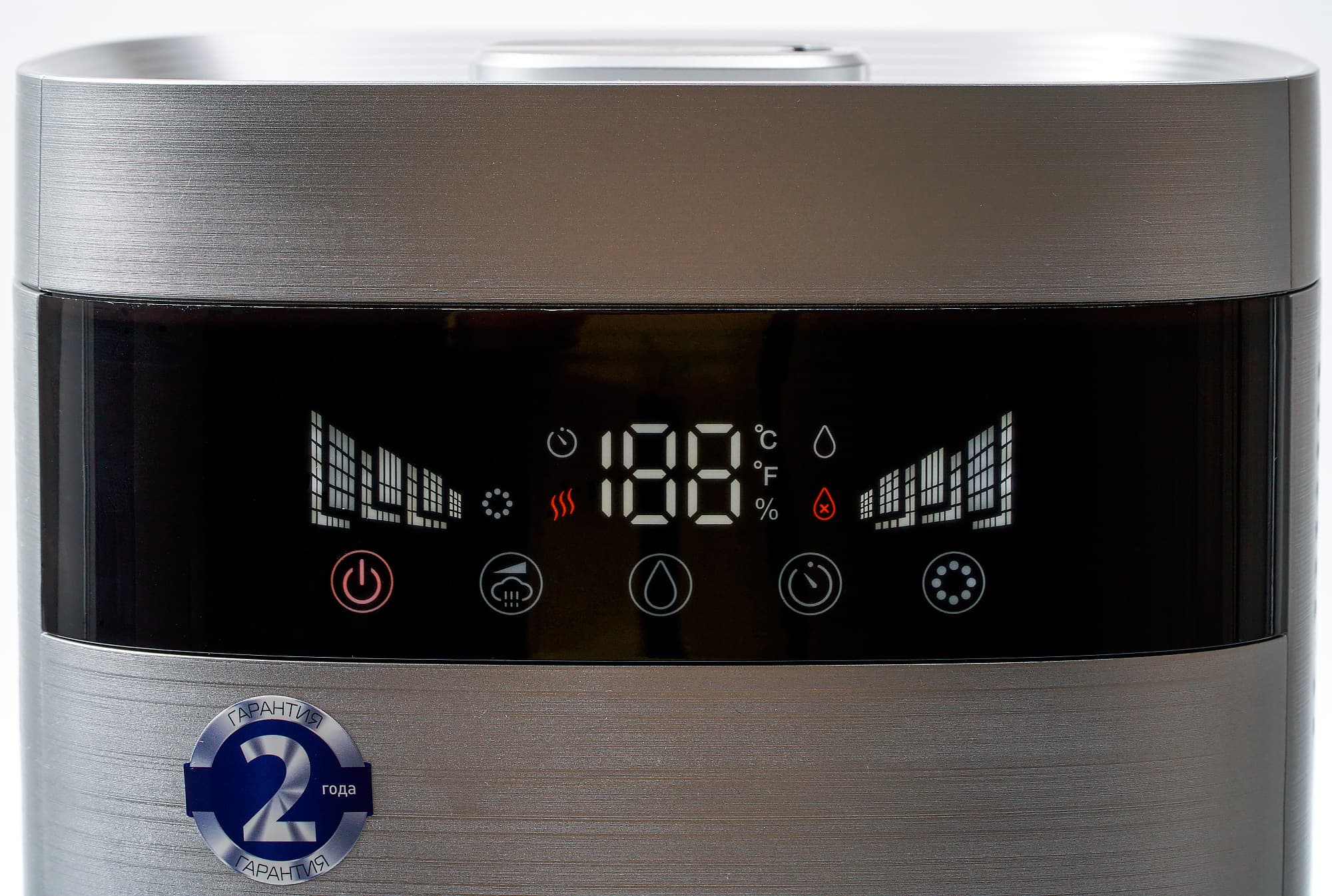 На его передней стенке мы видим черную панель управления, включающую LED-дисплей и сенсорные кнопки.