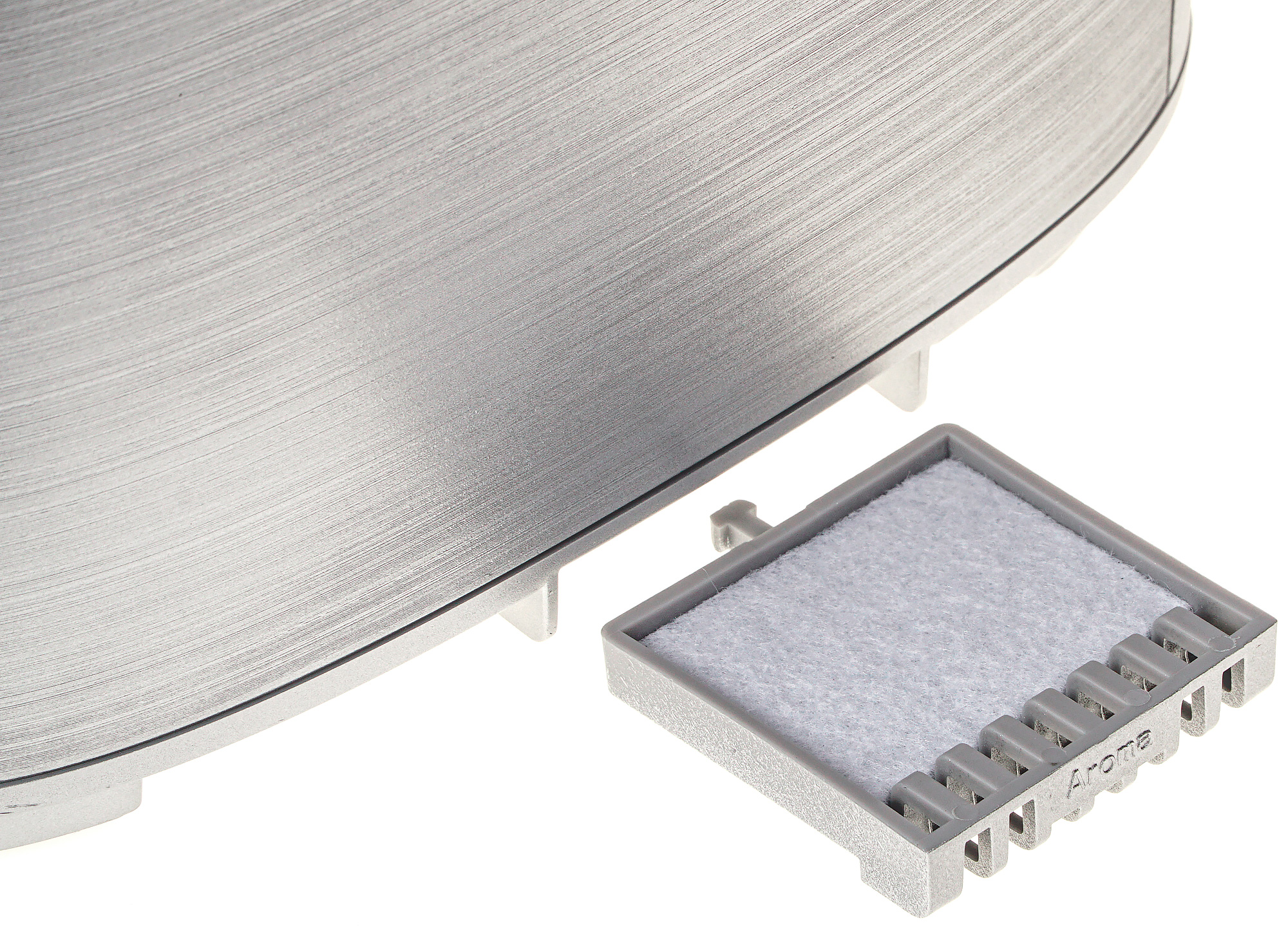 На боковых стенках имеются круглые вентиляционные отверстия, размещенные в виде прихотливого узора. Внизу одной из них, левой, расположена выдвигающаяся капсула для ароматических веществ (аромамасла). Она представляет собой небольшой квадратный пластиковый поддон, в котором находится фильтр из пористого материала. Для извлечения поддона необходимо нажать на него, слегка вдавив внутрь корпуса. Вставляется он легким, до щелчка, нажатием.