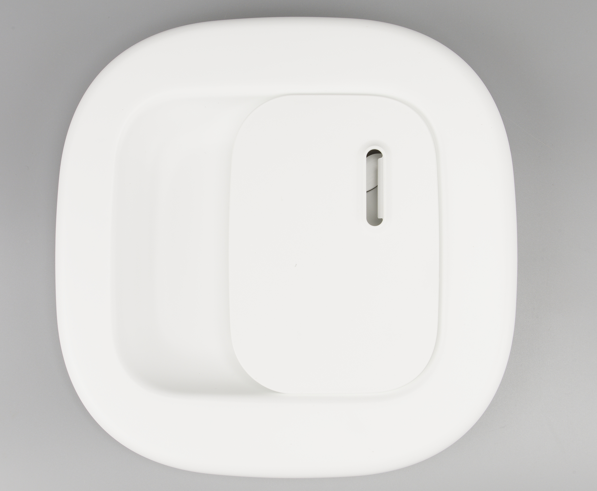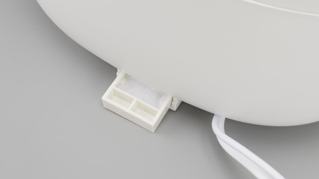С тыльной стороны в нижней части правой стенки расположен миниатюрный контейнер для добавления аромамасел. На своем месте он фиксируется с помощью защелки, срабатывающей при нажатии. В самом контейнере мы обнаружили кусочек пористого материала, хорошо впитывающего влагу.