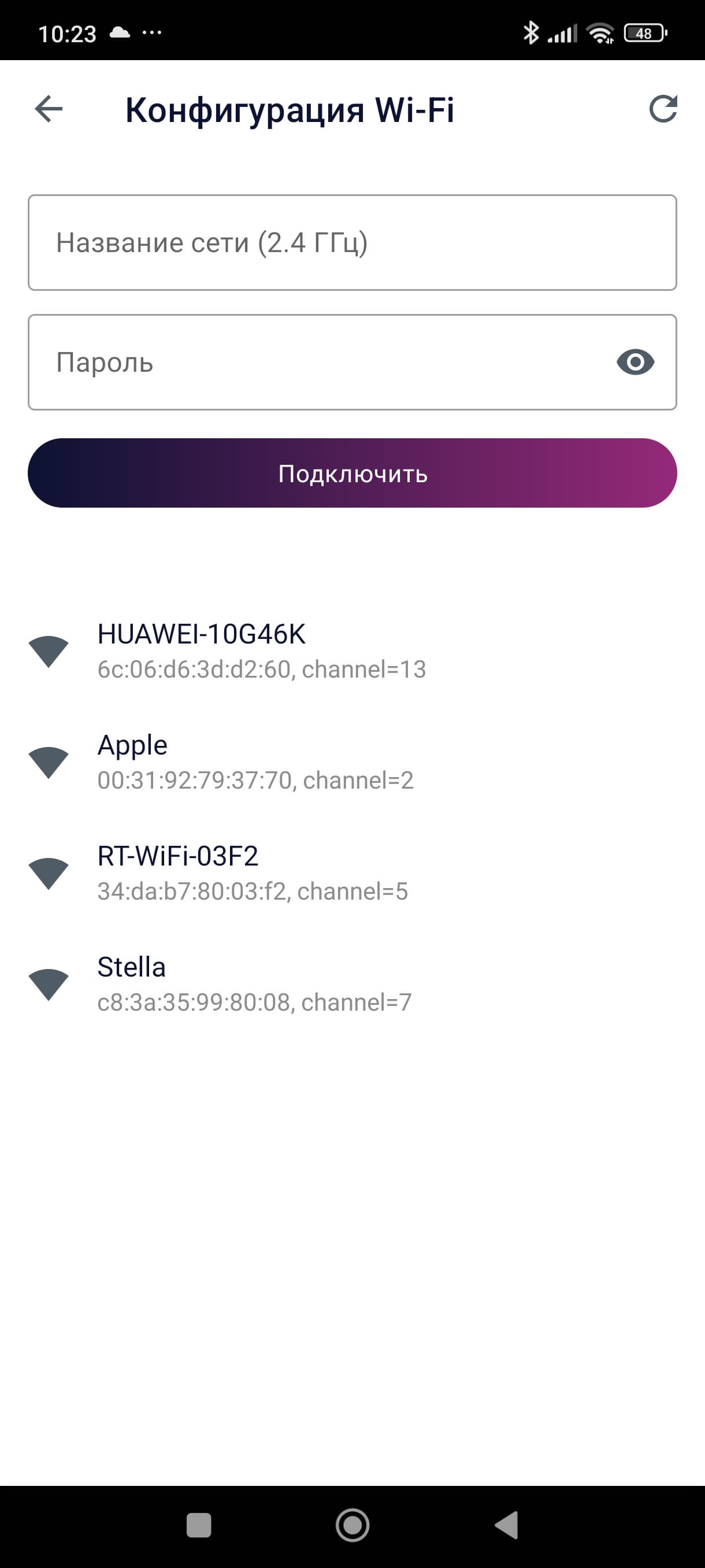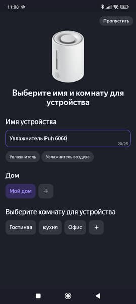 Классический метод подключения хорошо известен: устройство обнаруживается самостоятельно (либо его можно выбрать из списка), после чего пользователю нужно подключиться к Wi-Fi-сети увлажнителя и передать ему необходимые данные (пароль от роутера).