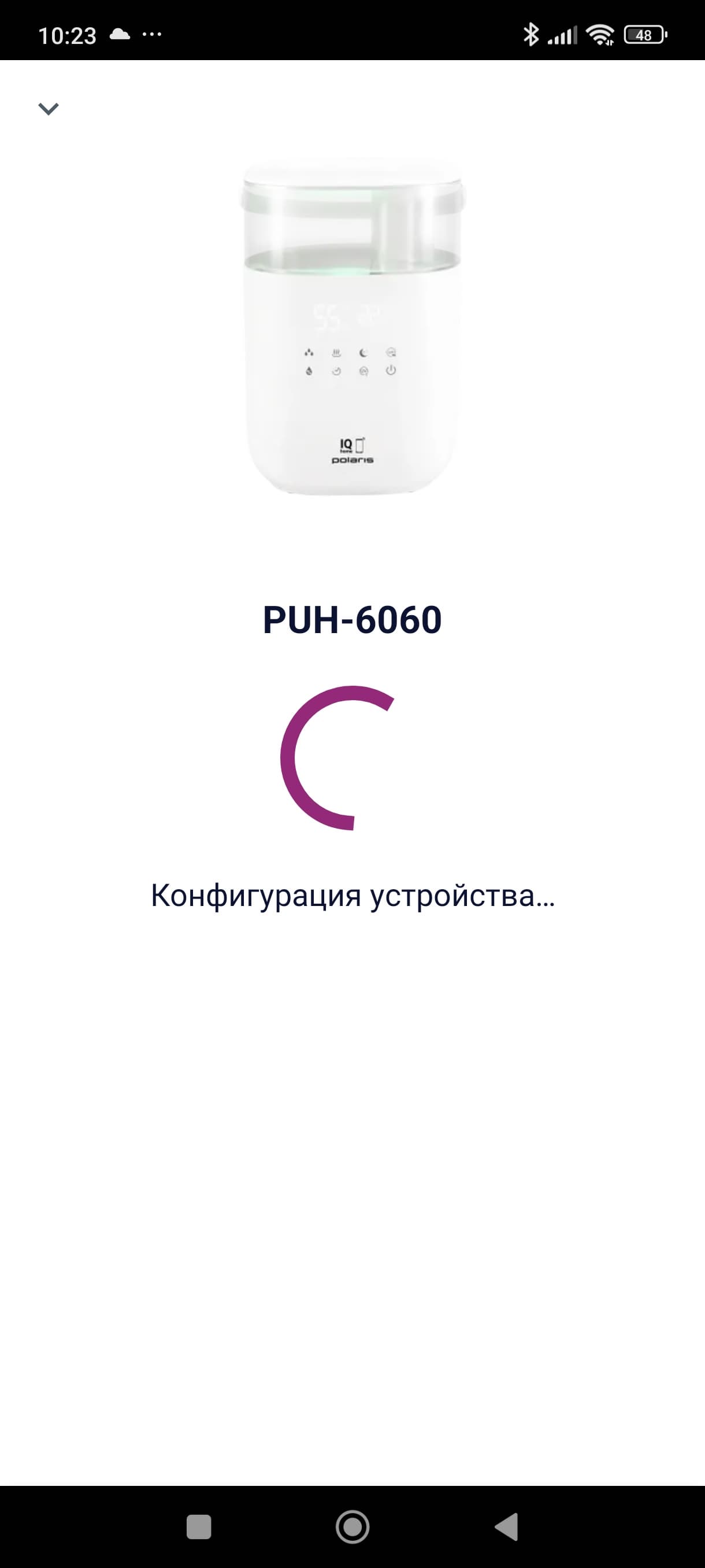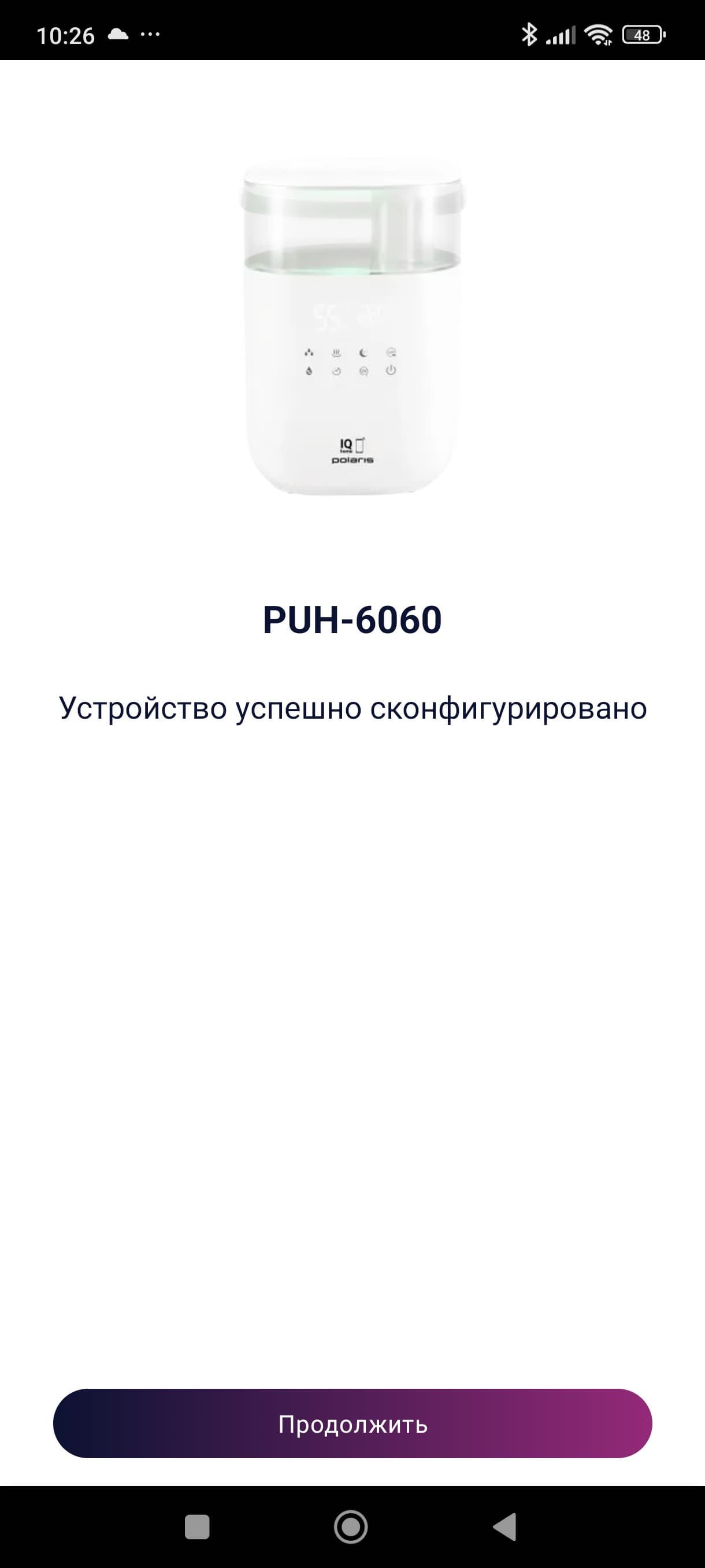 Инструкция приводит шаги по установке связи увлажнителя с приложением для Android и iOS. Следуя подсказкам, мы скачали приложение Polaris (IQ Home).