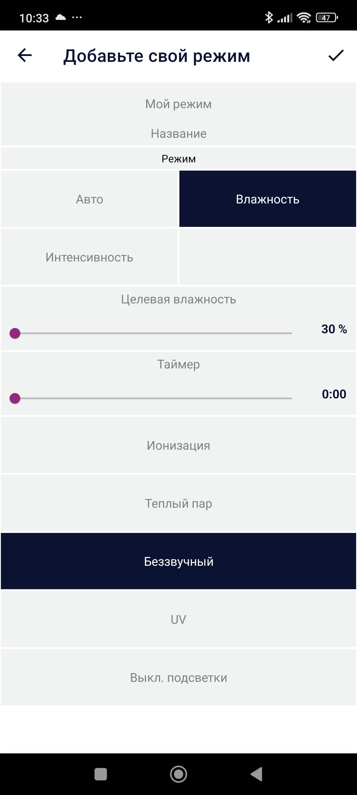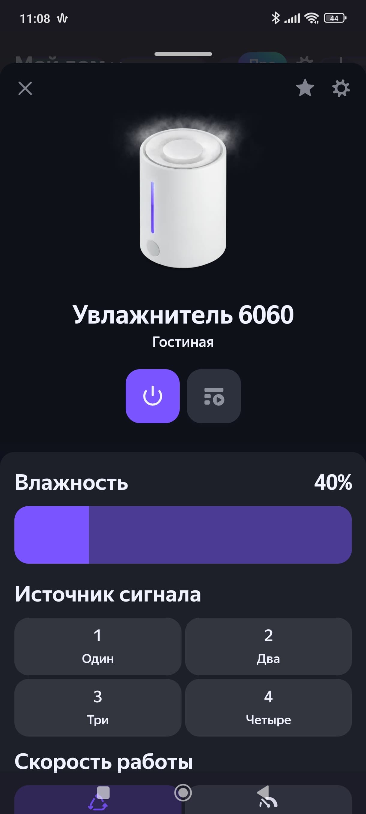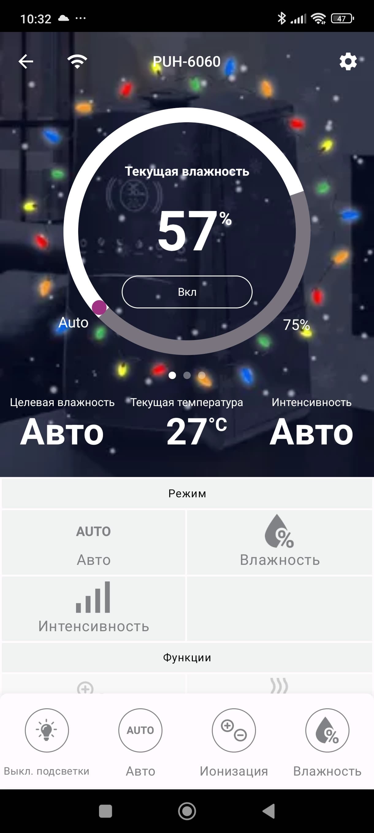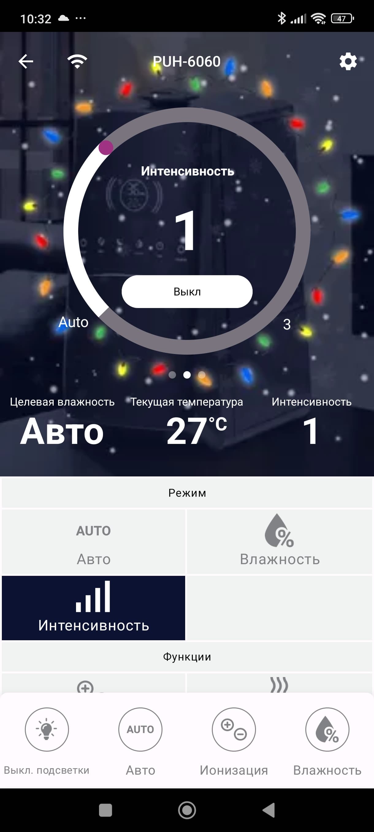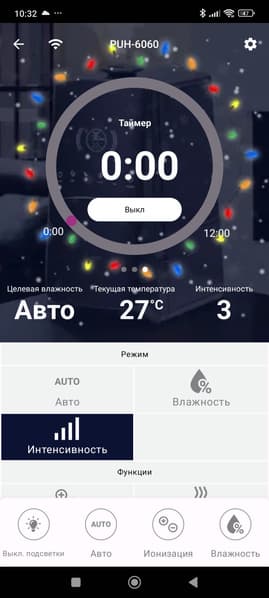 Под кругом находится информация о выбранном режиме, а рядом — температура и выбранная интенсивность увлажнения.