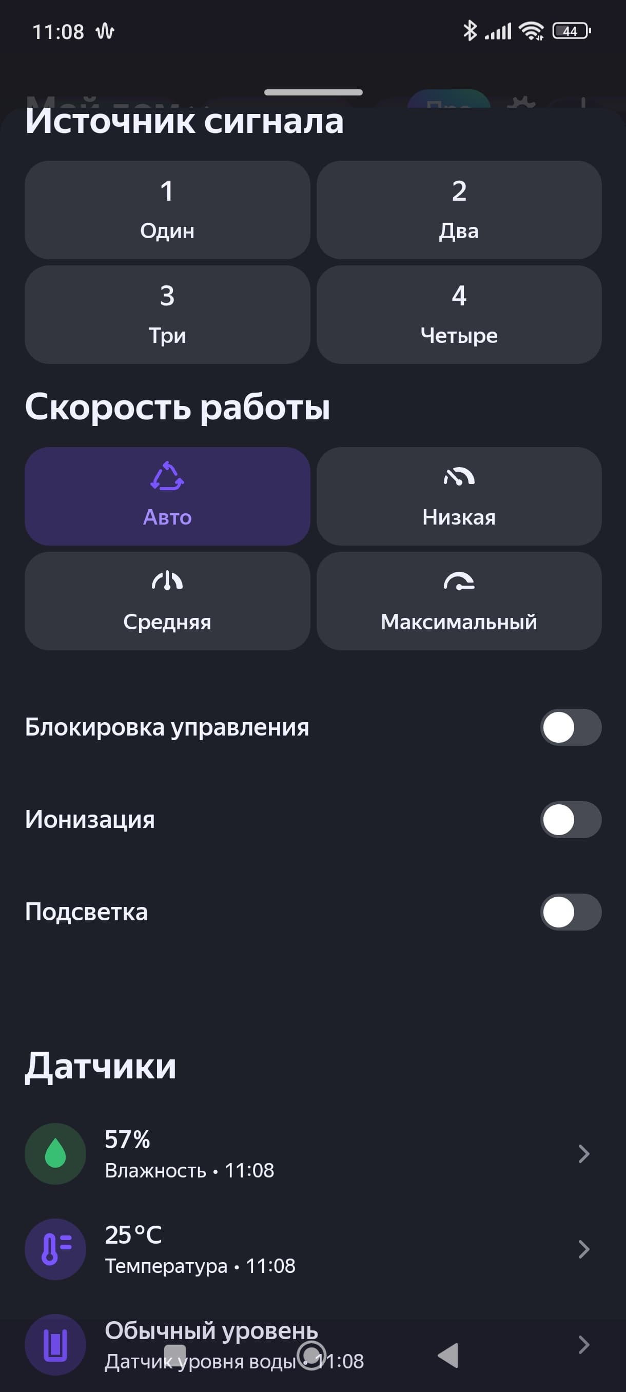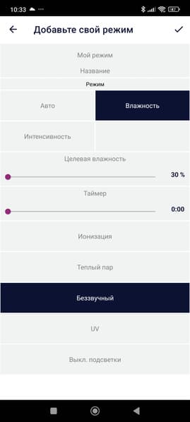 Тут можно изменить целевую влажность, выбрать «скорость работы» (т. е. интенсивность увлажнения), заблокировать панель управления прибора, а также включить либо отключить ионизацию.