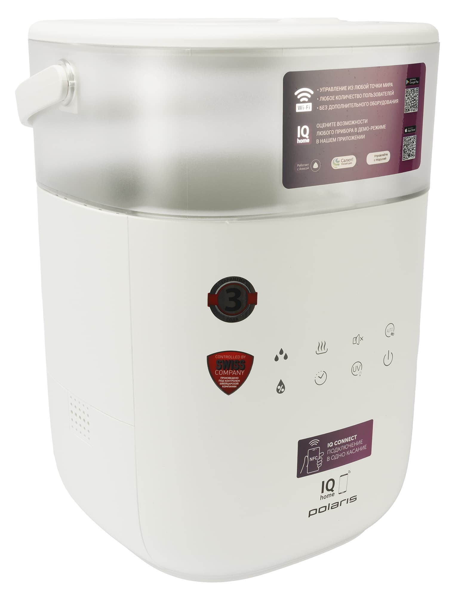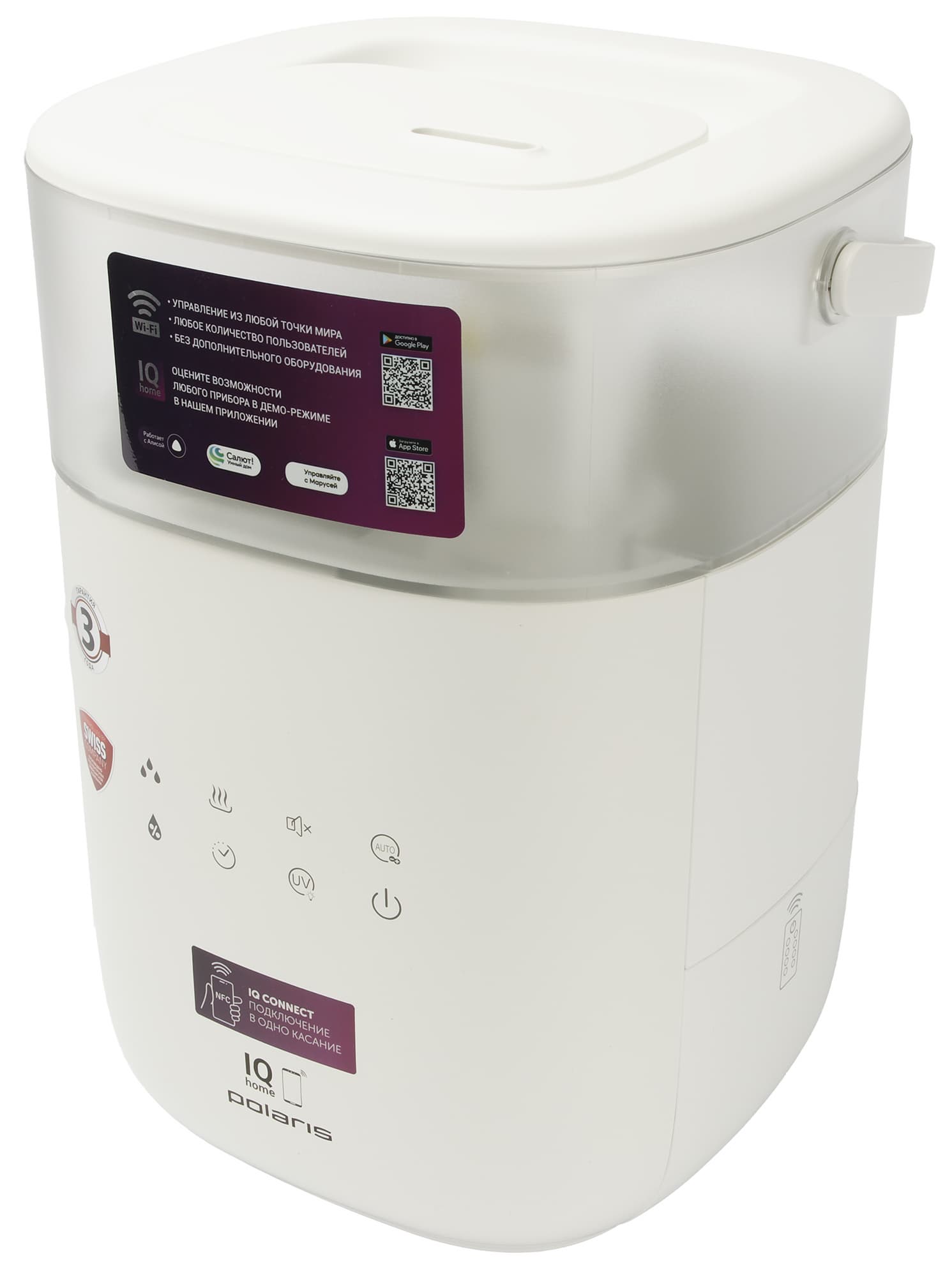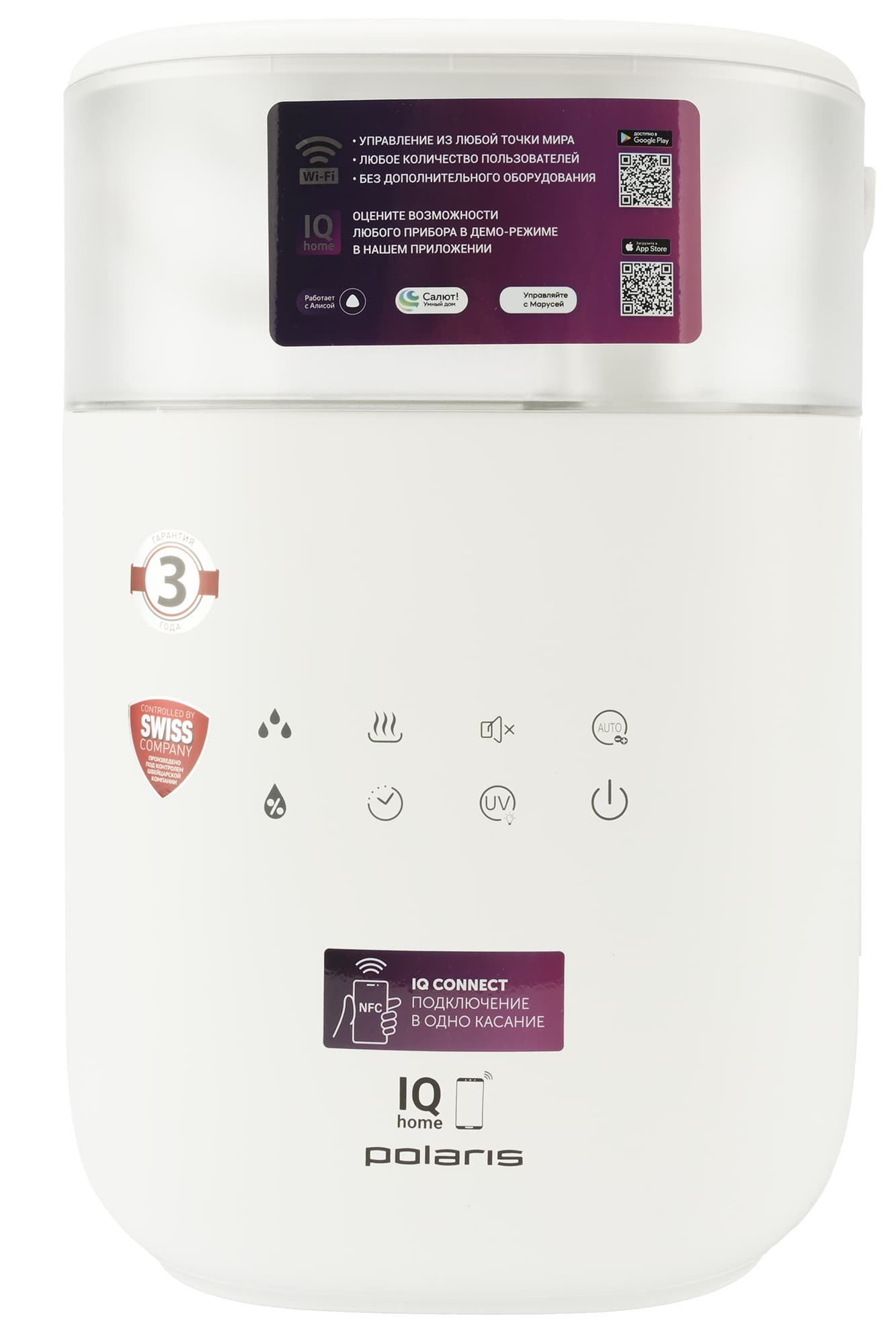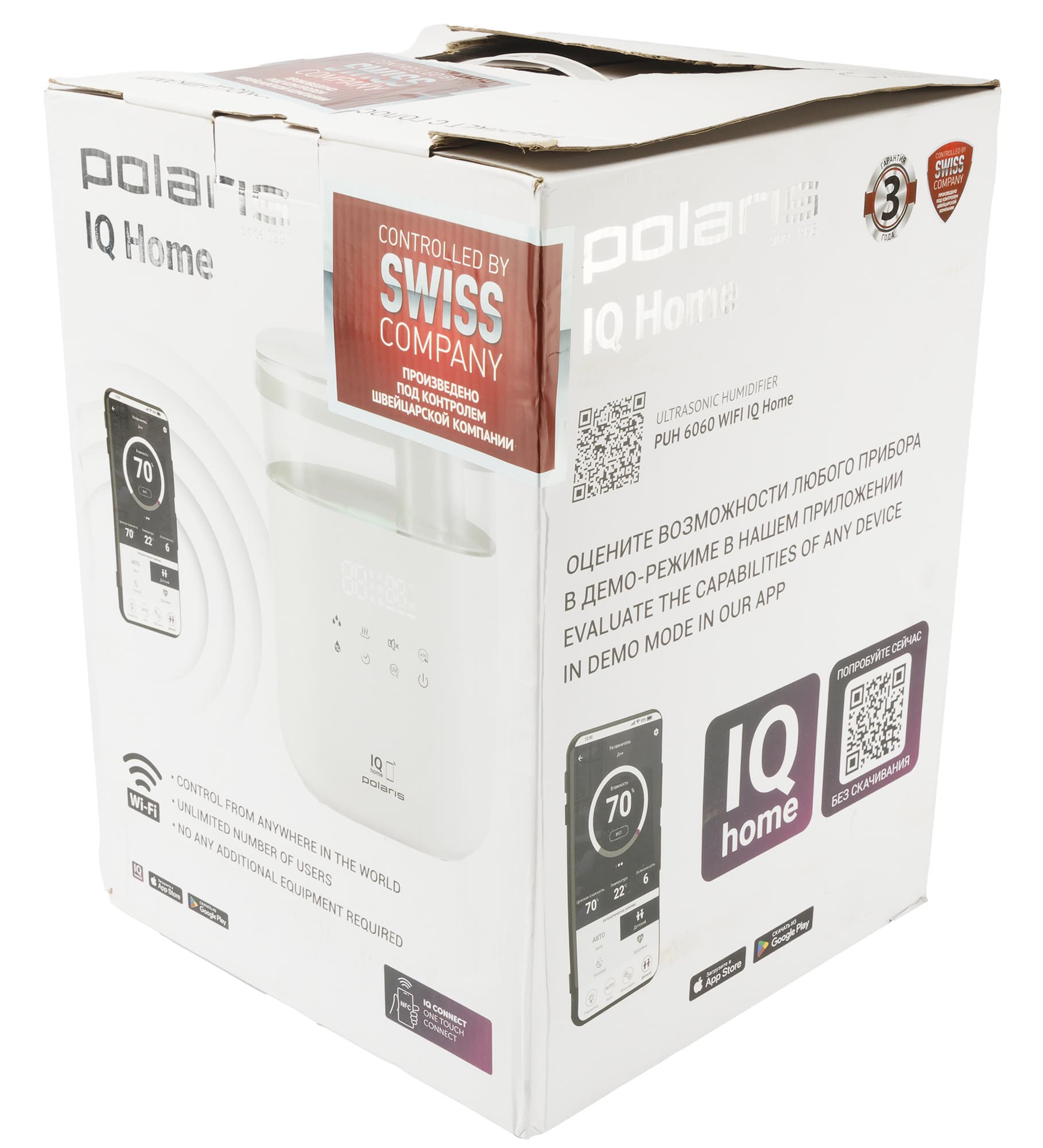 Внимание также привлекают плашки с информацией о швейцарском контроле производства и трехлетней гарантии. Помимо этого, на упаковке есть QR-код, позволяющий скачивать фирменное приложение для управления прибором.