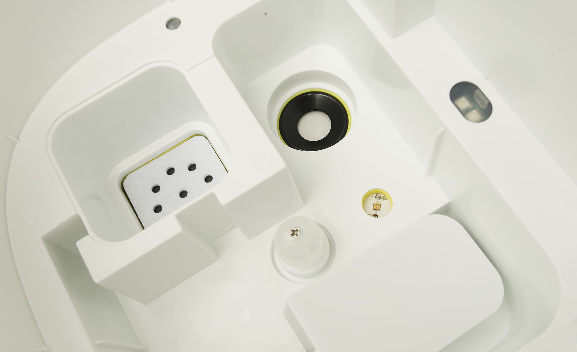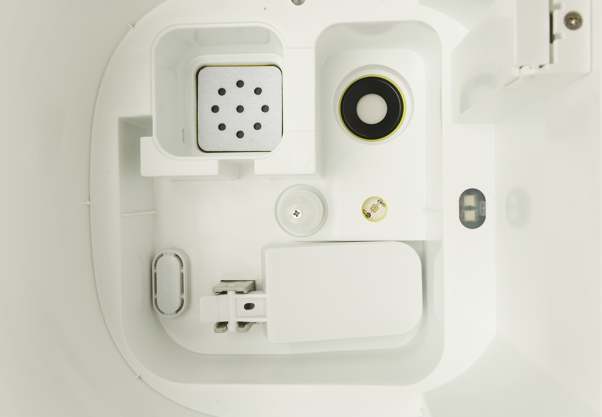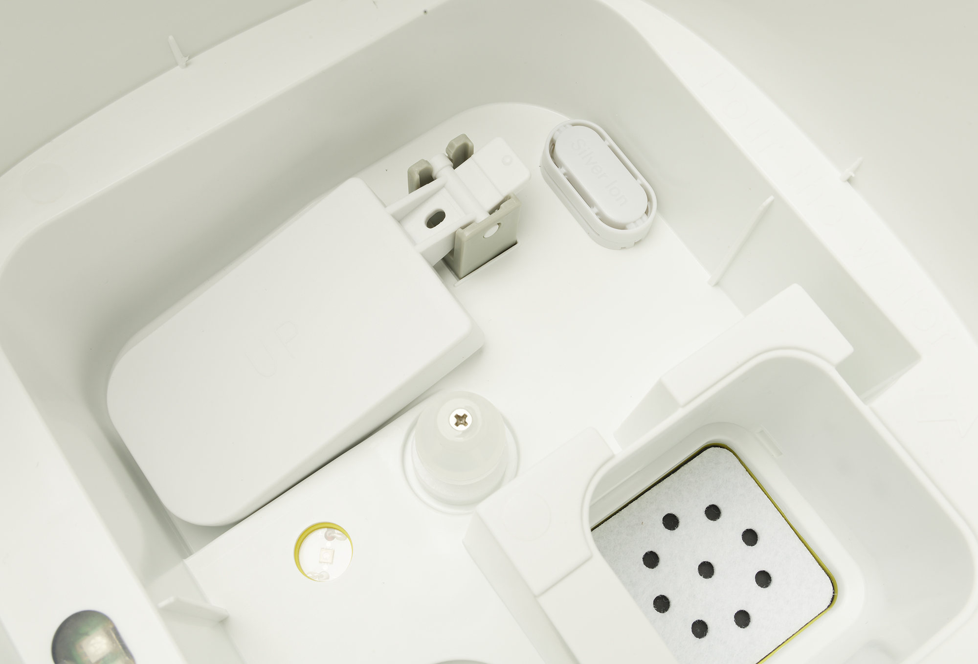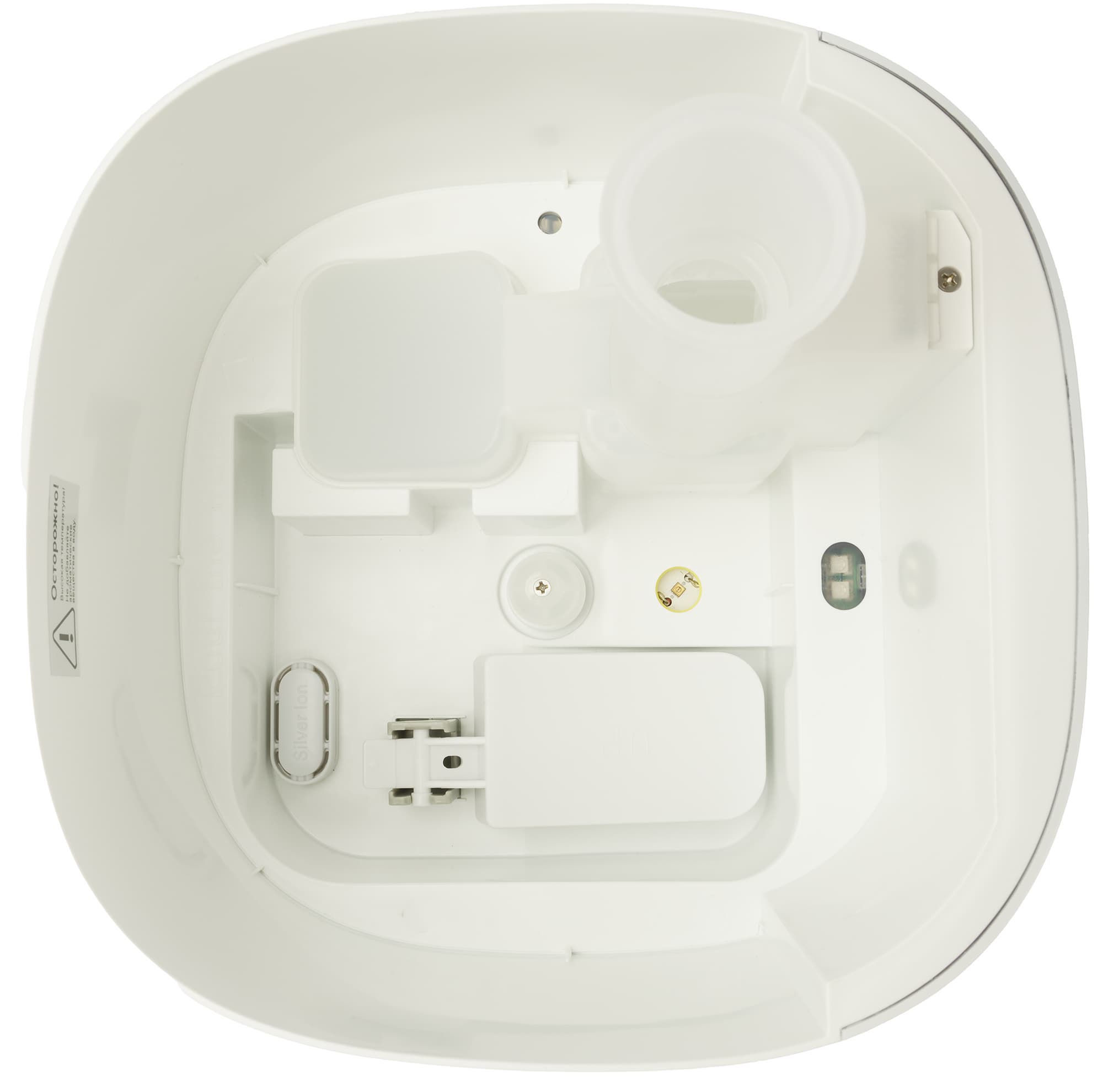 Под баком расположена рабочая емкость увлажнителя, в том числе: мембрана ультразвукового излучателя, воздухозаборник, блок ионизатора и поплавок, сигнализирующий о низком уровне воды в устройстве.