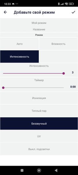Главный экран приложения представляет собой своеобразный пульт управления, состоящий из трех экранов. На первом из них можно установить целевую влажность, на втором — скорость увлажнения, а третий экран отведен под таймер автоматического отключения (до 12 часов с шагом в 1 час).