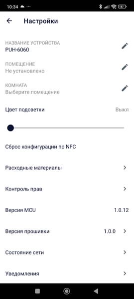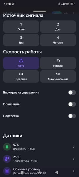 Нажав на кнопку с изображением прибора, попадаем на главный экран. Он же — «пульт управления» увлажнителем.