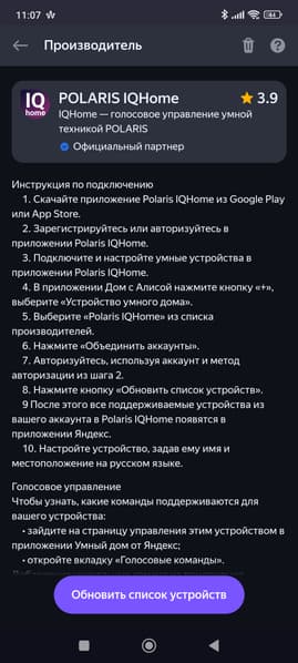 Как и со многими другими устройствами Polaris (и не только), увлажнителем можно управлять с помощью голосового помощника Алисы. Для этого нужно будет предварительно «подружить» прибор с системой умного дома «Яндекса».