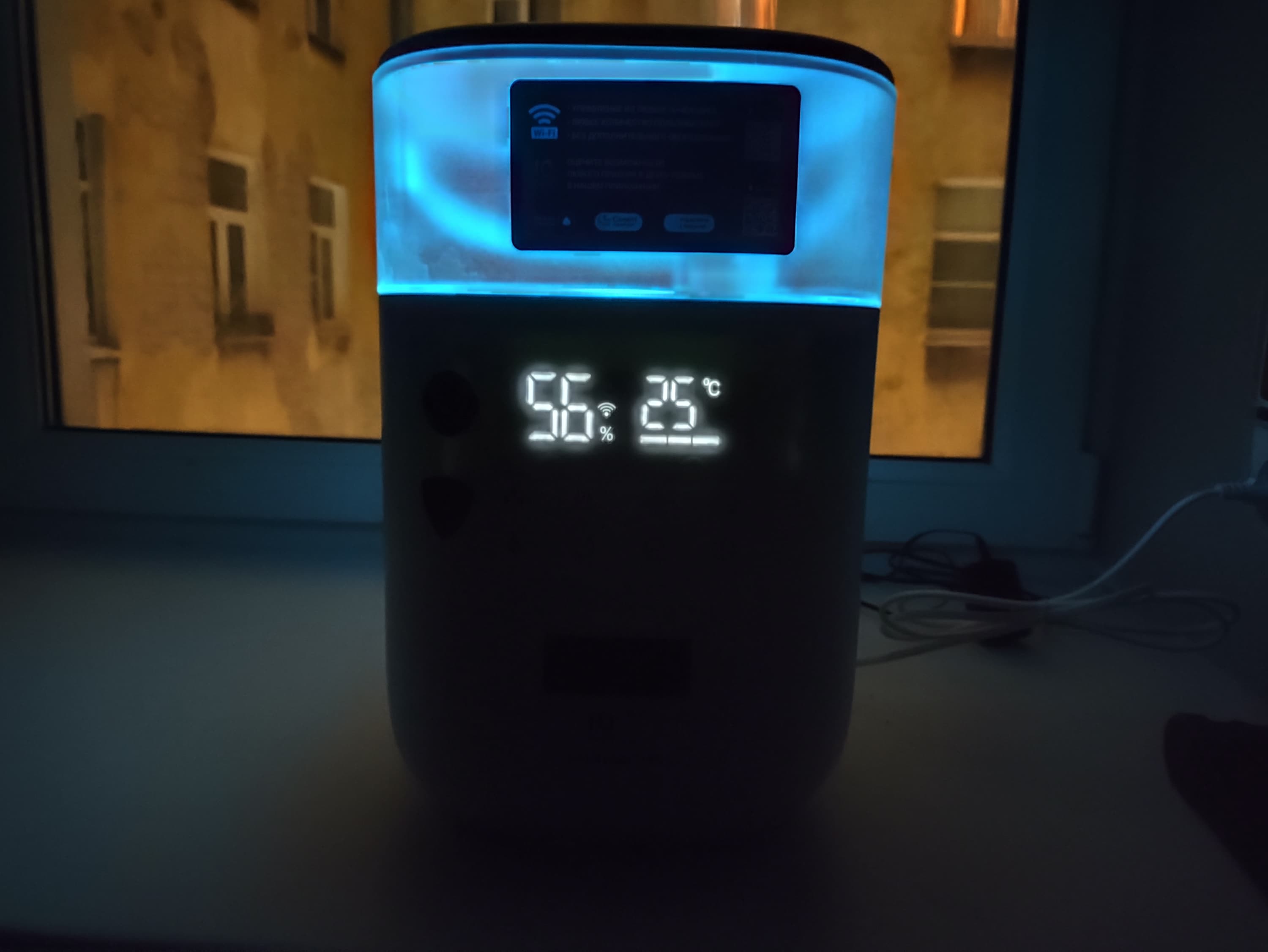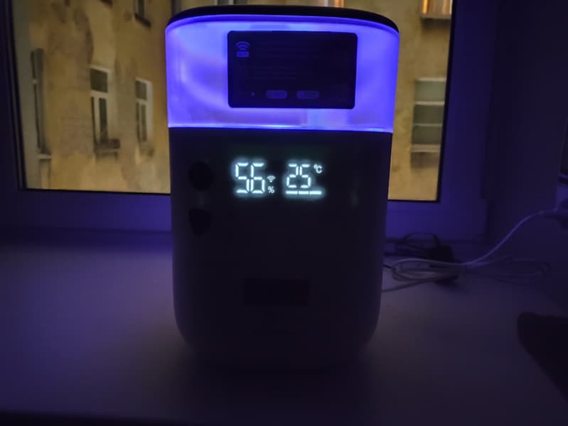 При нажатии на кнопку включения прибор начинает работу в автоматическом режиме — то есть, начинает контролировать уровень влажности в зависимости от температуры в помещении. На экране при этом будет отображаться текущая влажность и температура. Если это не первое включение, и увлажнитель уже был связан с приложением на смартфоне, то дополнительно загорается белым значок Wi-Fi.