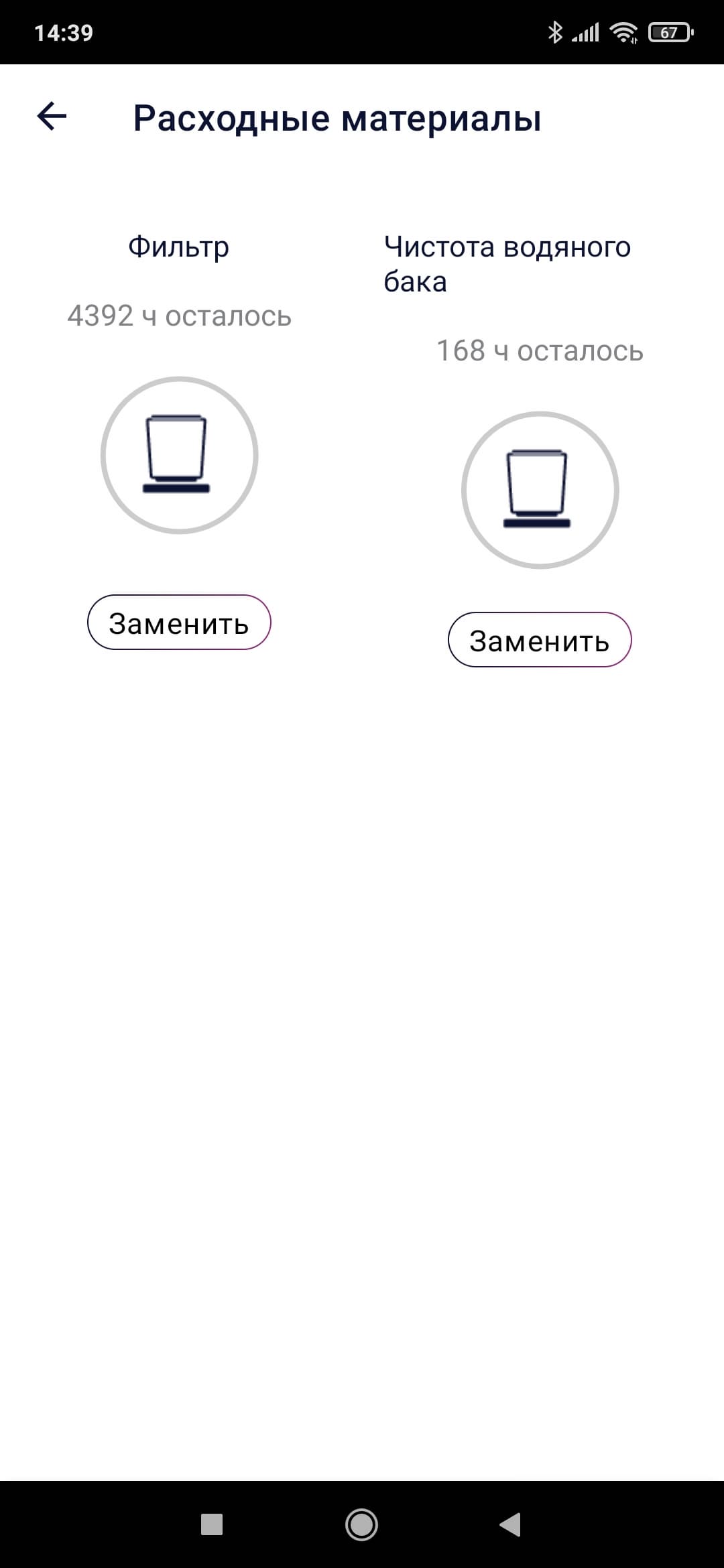 Сюда имеет смысл заглядывать разве что чтобы узнать оставшийся ресурс фильтра, а также — определиться с тем, не пора ли почистить бак для воды.