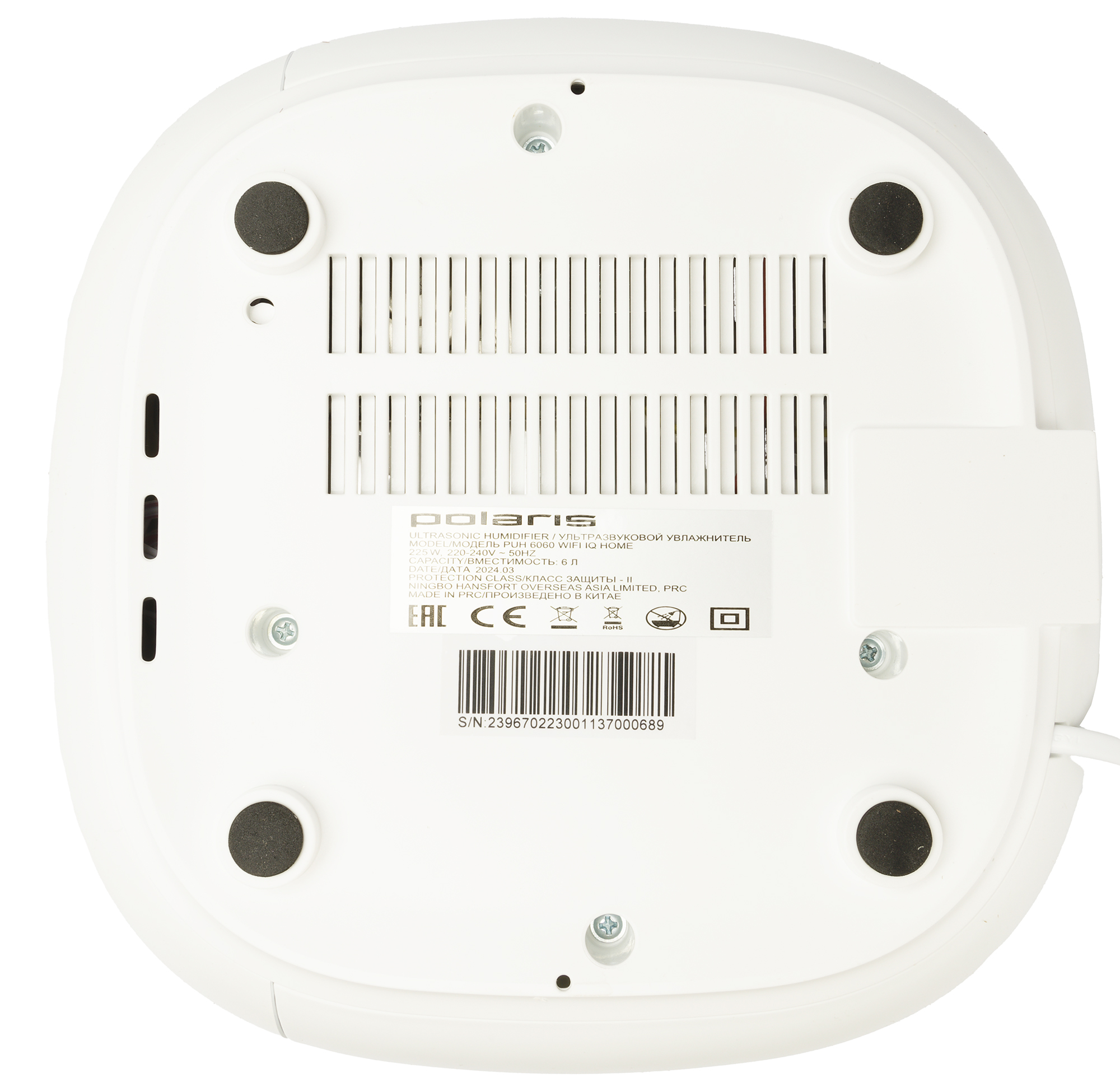 На дне прибора размещены четыре круглых ножки с прорезиненными накладками, обеспечивающими хорошее сцепление с любой гладкой поверхностью, а также шильдик с названием производителя, модели, техническими характеристиками, информацией о стране-производителе и серийным номером.