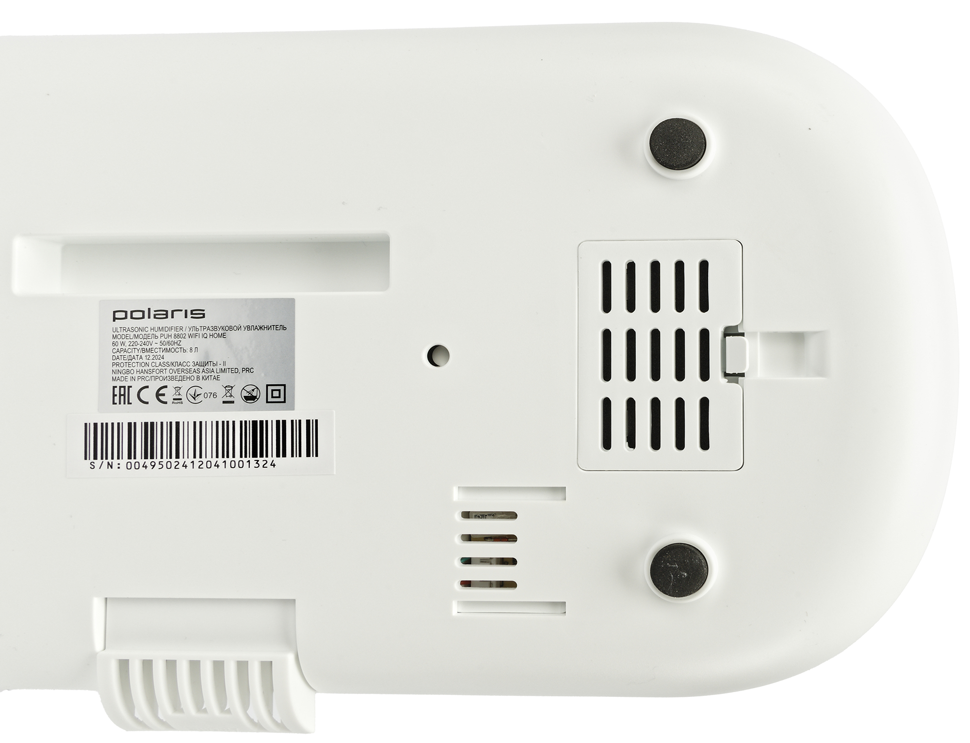 На дне прибора размещены четыре круглые ножки с черными прорезиненными накладками, обеспечивающими хорошее сцепление с любой гладкой поверхностью, а также шильдик с названием производителя, модели, техническими характеристиками, информацией о стране-производителе и серийным номером.