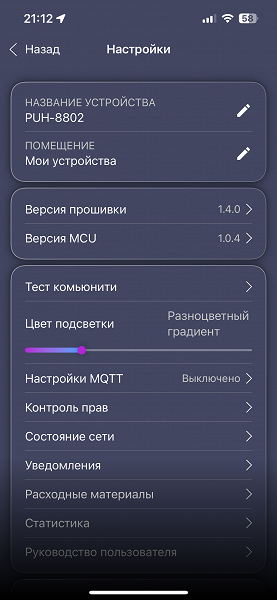 Подсветка у прибора не очень яркая, но красивая. При работе в режиме «Цветной градиент» вся цветовая гамма меняется медленно, цвета незаметно переходят друг в друга и слабо освещают пространство в 15-20 см от крышки прибора.