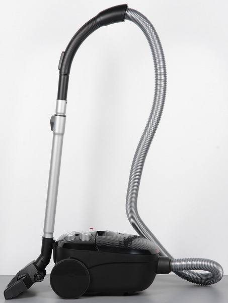 Дизайн практичный, а сочетание цветов можно назвать классическим — черный и серебристый. Корпус пылесоса и аксессуары изготовлены в основном из пластика. Чаще всего применяется черный без покрытия пластик с матовой поверхностью, но внешние плоскости колес и верхняя часть корпуса моторного блока имеет зеркально-гладкую поверхность, при этом внимание привлекает геометрический рельефный узор на крышке отсека для мешка. Кнопки на корпусе и крышка выпускного фильтра — с матовым серебристым покрытием, а фиксаторы двух крышек корпуса моторного блока — с темно-красным серебристым покрытием.