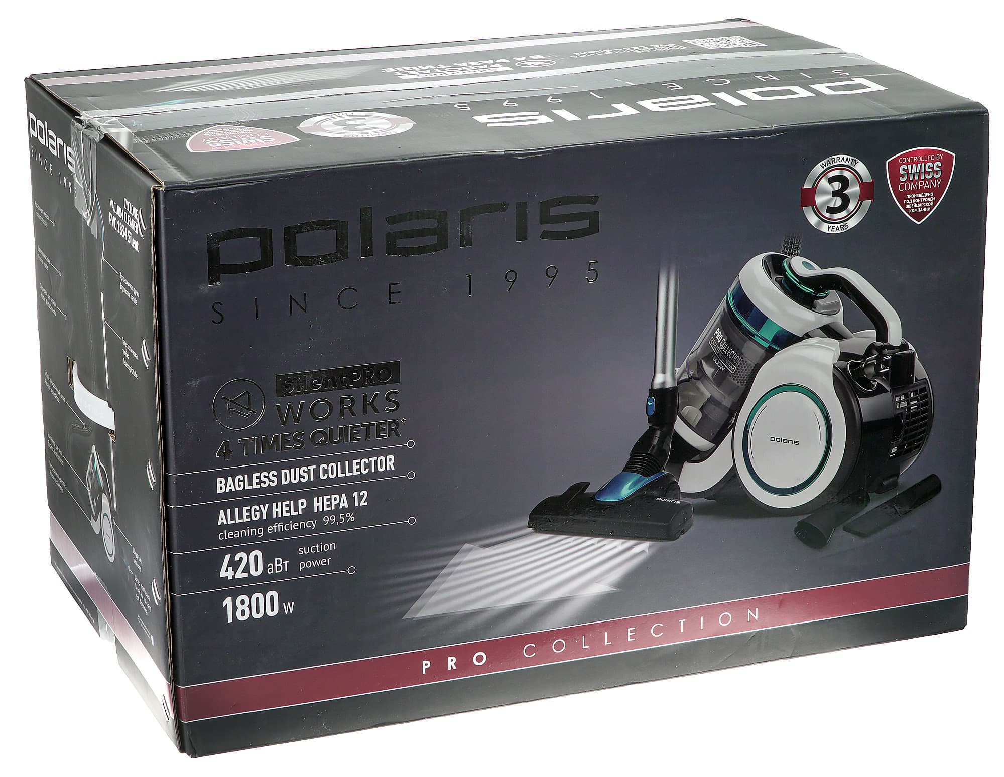 Упакована эта модель в красочную коробку с цветными фотографиями. На ее лицевую и обратную стороны вынесены главные особенности пылесоса: низкий уровень шума, мусоросборник без мешка, HEPA-фильтр двенадцатого класса и высокая мощность — как потребляемая, так и эффективная. Среди преимуществ производитель упоминает также трехлетнюю гарантию и производство под контролем швейцарской компании.