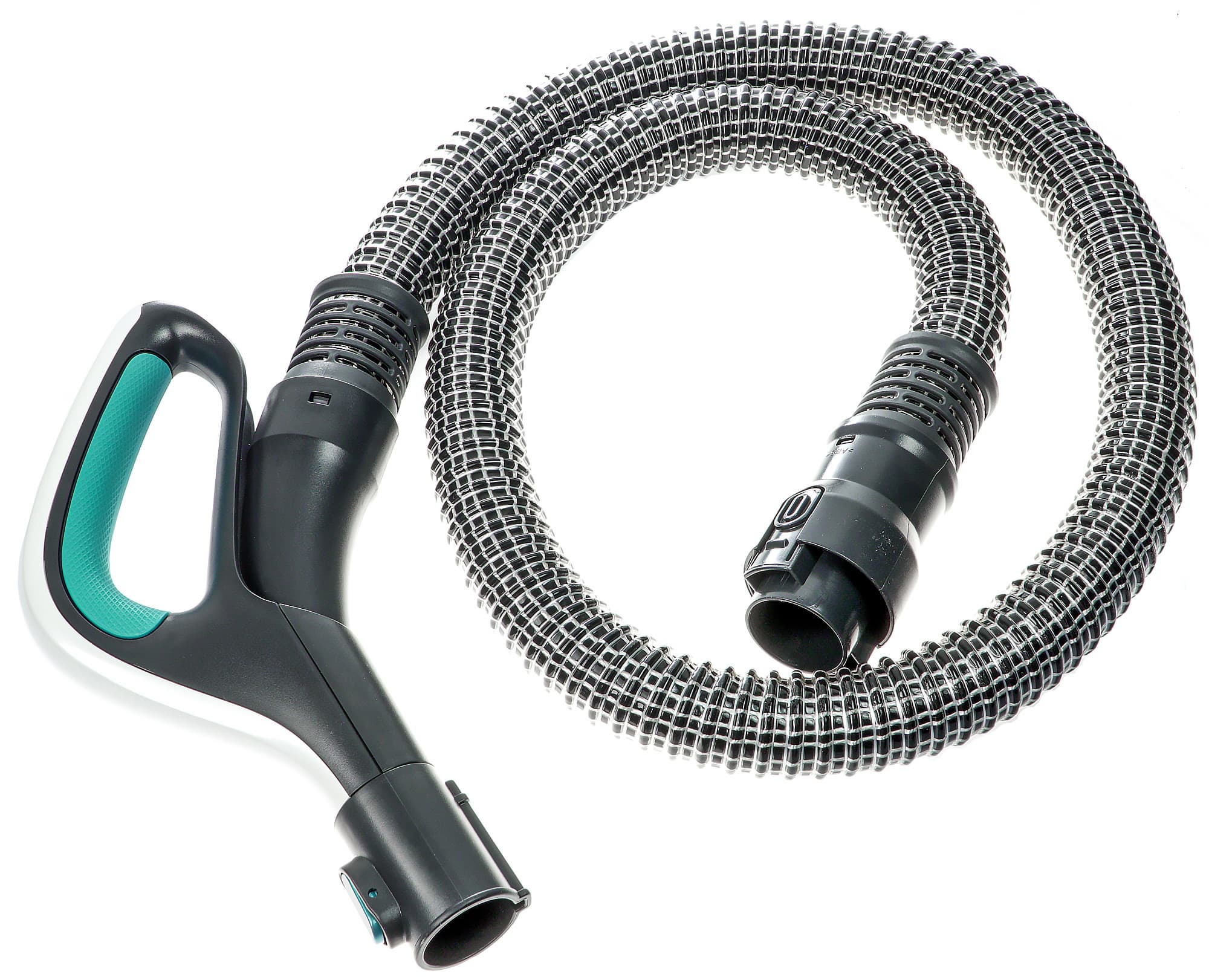 Гофрированный шланг с броским черно-белым узором покрыт силиконом, что защищает его от повреждений и загрязнений. На его рабочем конце находится несъемная ручка эргономичной формы. Длина шланга без рукоятки — 160 см.