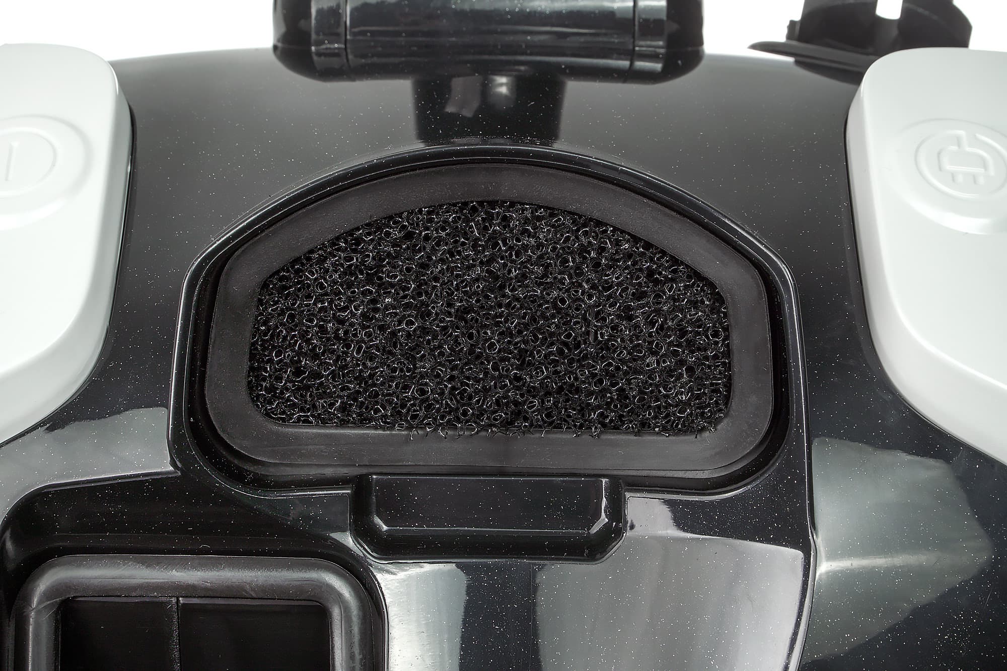 Еще один фильтрующий элемент находится на входе в воздушный тракт моторного отсека — уже после фильтра тонкой очистки. Он представляет собой губку с довольно крупными порами и предназначен только для защиты двигателя от попадания посторонних предметов при снятом мусоросборнике: для фильтрации пыли он бесполезен.