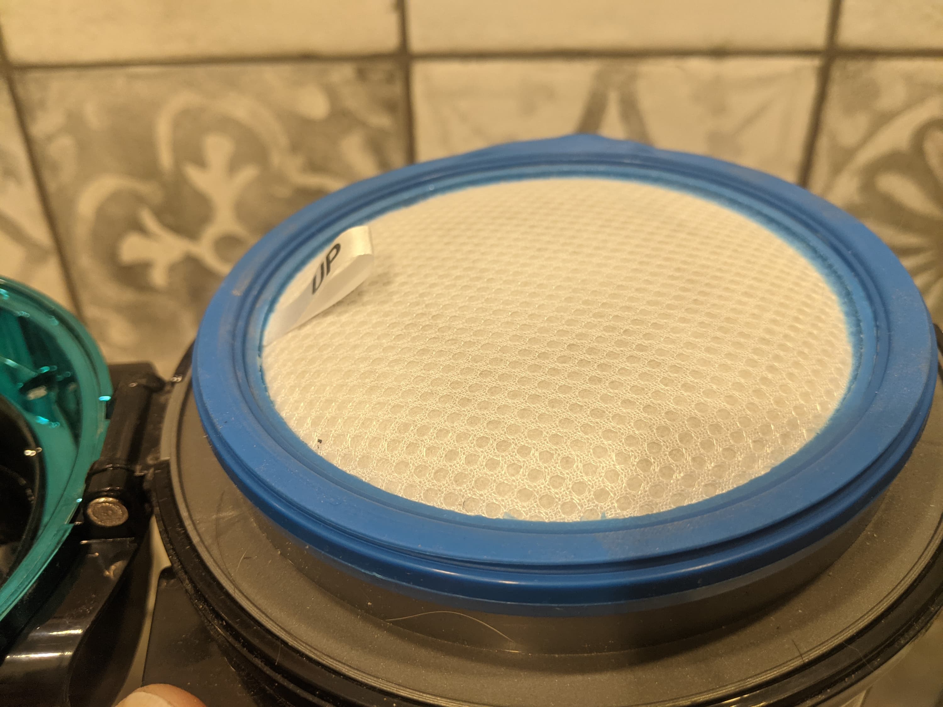 Мелкие частицы и пыль воздушной струей через центральную часть циклона поднимаются наверх, к фильтру тонкой очистки. Это большая «таблетка» из нескольких слоев нетканого материала с резиновым уплотнительным кольцом по периметру.