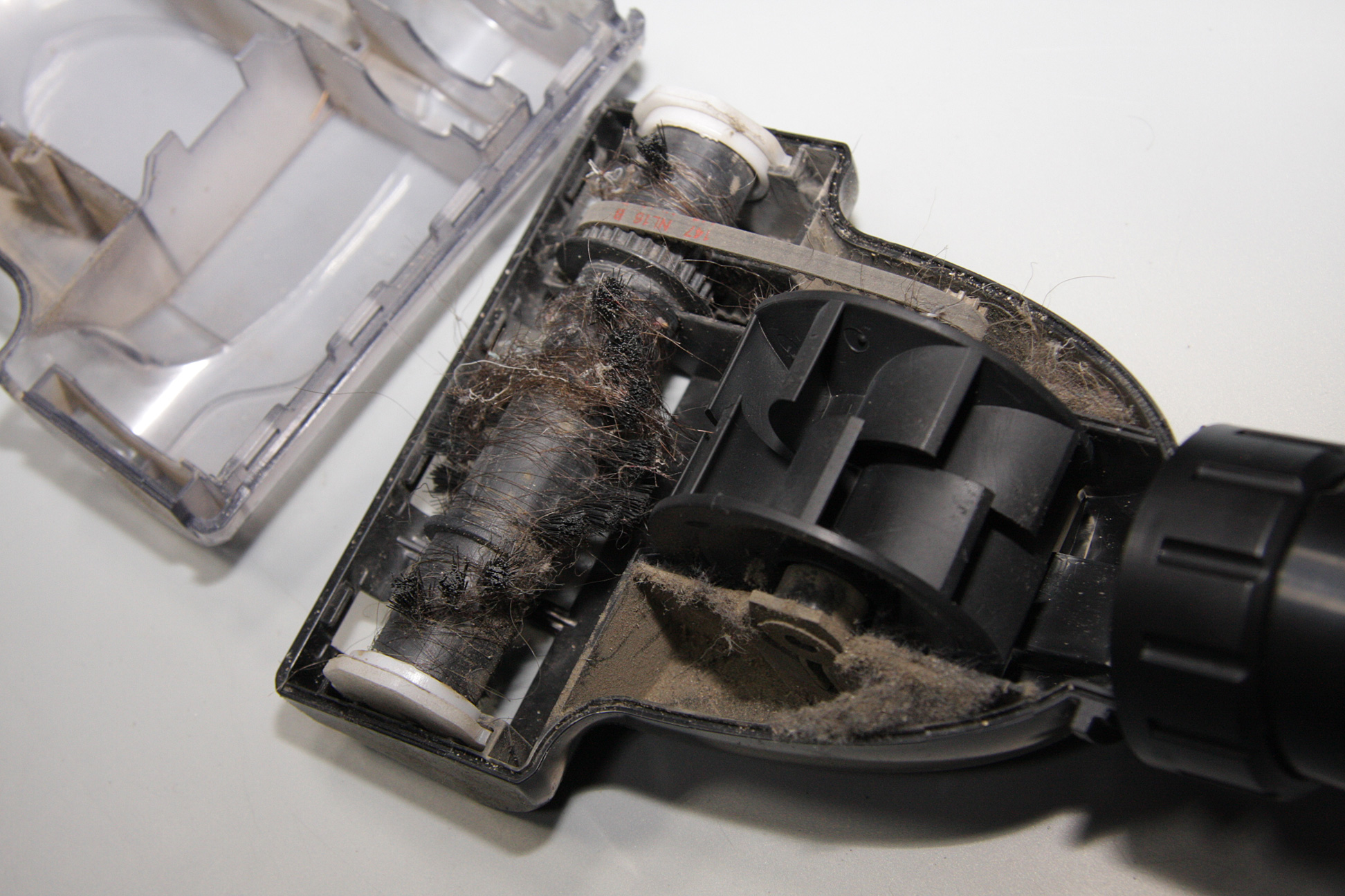 А выпускной фильтр HEPA с виду остался чистым. На вал турбощетки намоталось довольно много волос, ниток и т. д. Один раз щетка даже остановилась из-за намотавшегося на вал щетки и на турбину. Пришлось потратить некоторое время на снятие всего этого, в том числе с помощью ножниц.