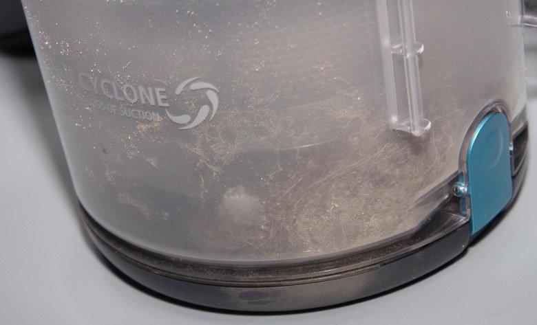 Большая часть мусора высыпалась при открытии крышки, только вверху циклонной камеры скопилось немного легкого мусора и часть пылеобразной субстанции налипло на внутренних стенках (почти все осыпалось при легком постукивании).