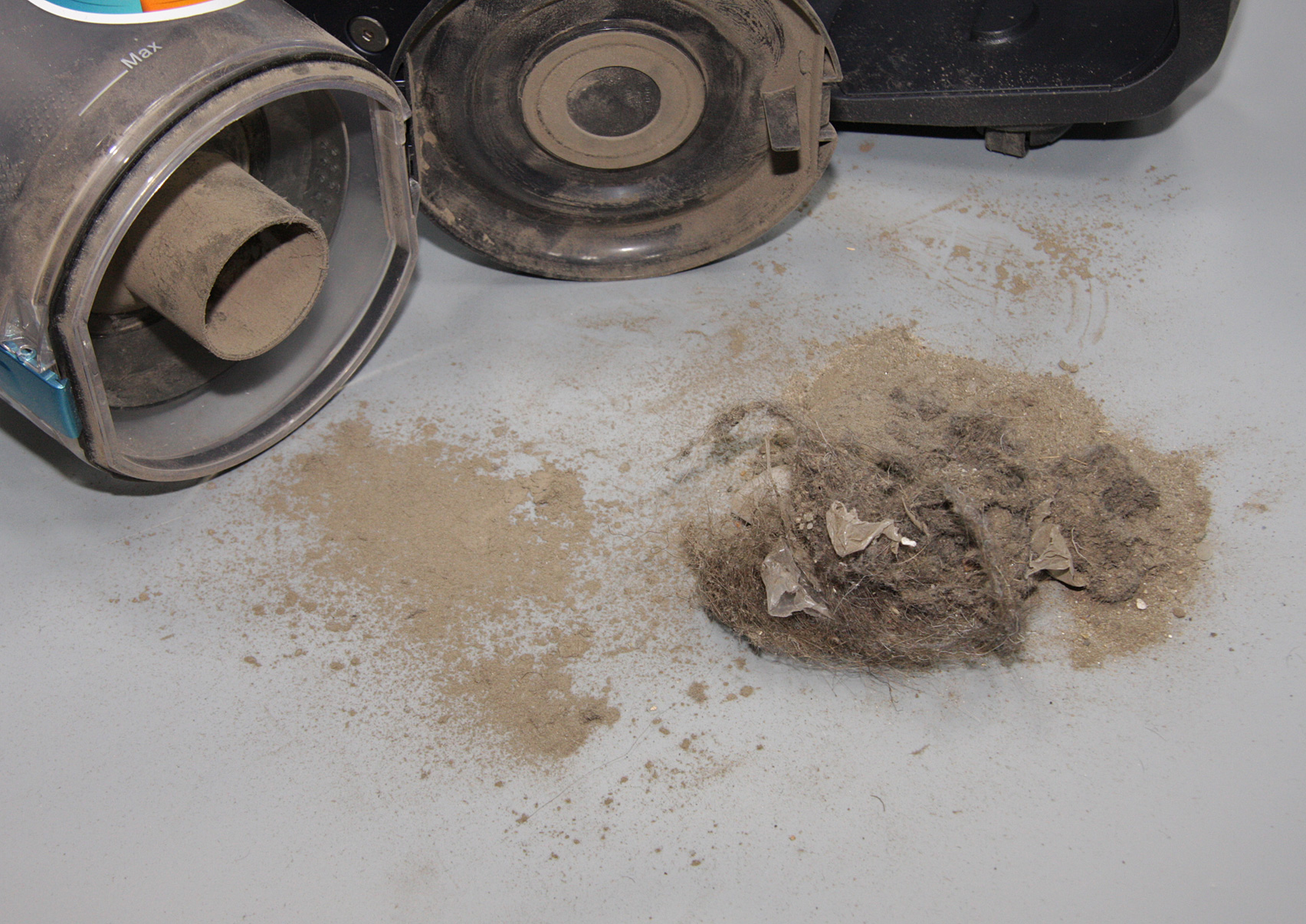 Преимущественный состав собранного мусора — это грязь с обуви (песок, глина, пыль), ворс с ковролина и ковриков, волосы и т. д. При работе пылесоса внутренняя поверхность пылесборника быстро царапается и покрывается тонким слоем пыли, поэтому, сколько в нем собралось мусора видно плохо.