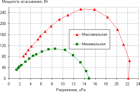 Инструментальные тесты в основном заключались в определении мощности всасывания и измерении уровня шума. Мощность всасывания (что это такое и как мы ее измеряем описано в отдельной статье) мы определяли при работе пылесоса на максимальной и на минимальной мощности. Зависимость мощности всасывания от создаваемого разрежения приведена на графике ниже: