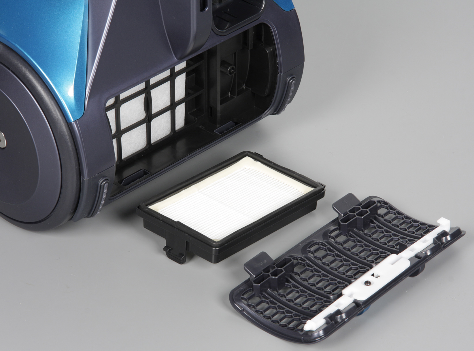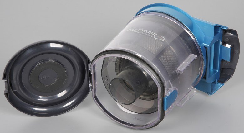 Система фильтрации трехступенчатая. Цилиндрический корпус пылесборника формирует большой циклон первой ступени, на которой отделяется большой и тяжелый мусор, а легкий и крупный мусор, типа волокон и шерсти задерживается сеткой из отверстий. Далее десять мелких циклонов сепарируют мельчайшую пыль и воздух, пыль сваливается в изолированную камеру в центре контейнера пылесборника, а воздух через предмоторный фильтр идет к вентилятору. Выходит воздух через решетку сзади, за которой установлен фильтр HEPA13.