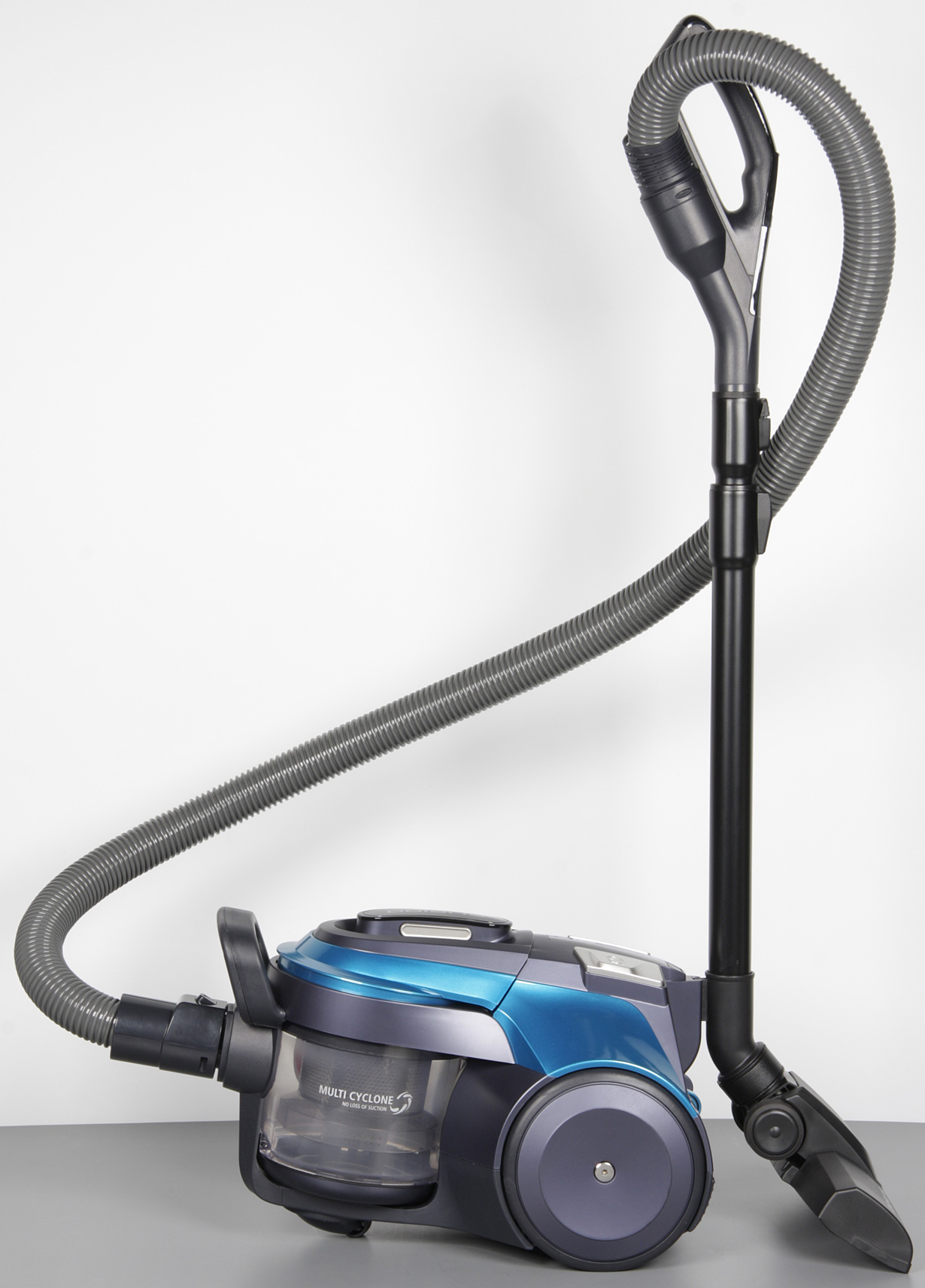 Дизайн практичный, сочетание цветов приятное и спокойное. Корпус пылесоса и аксессуары изготовлены в основном из пластика. Чаще всего применяется черный без покрытия пластик с матовой поверхностью, но в корпусе моторного блока есть детали с синей зеркально-гладкой поверхностью типа «металлик», с черным зеркально-гладким покрытием, матовым серебристым, а также элементы с темно-фиолетовым серебристым покрытием.