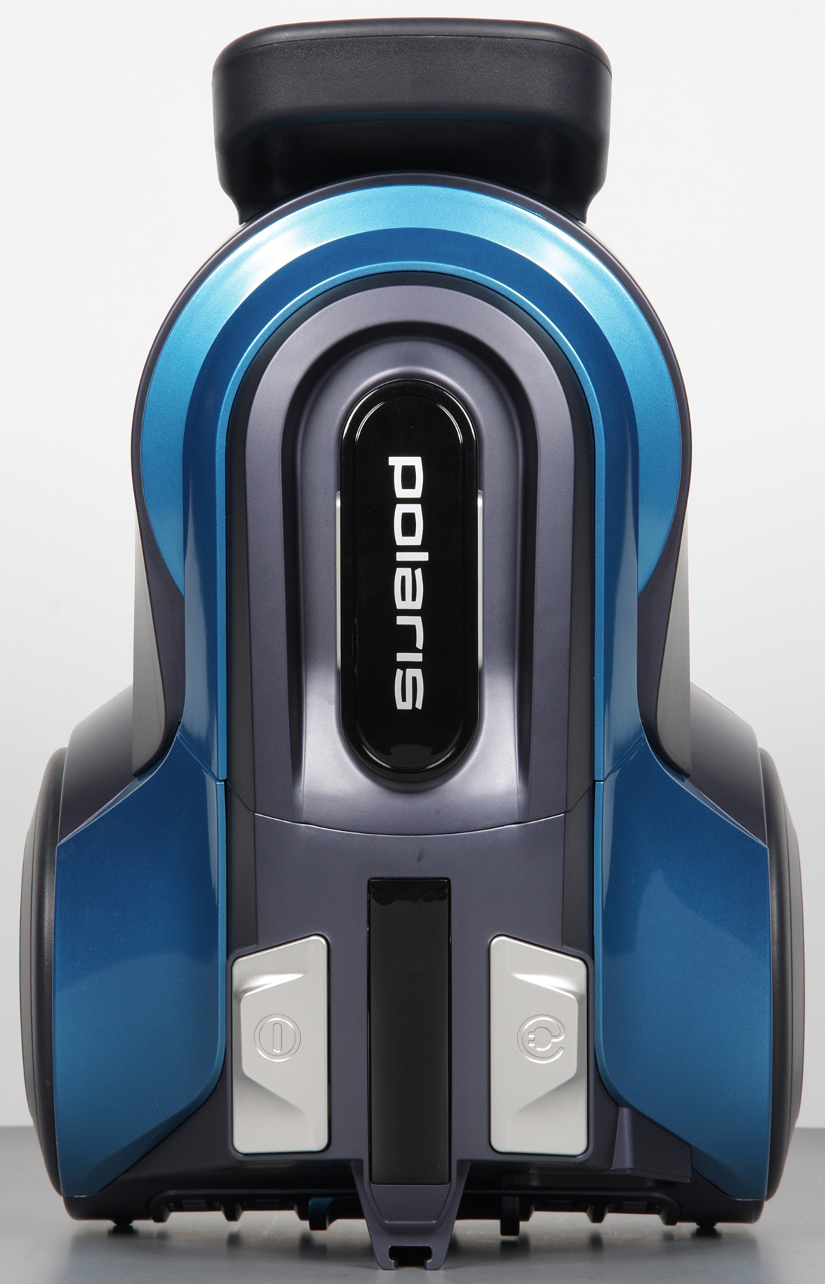 По бокам сверху в задней части есть две педали: левая — включает-выключает пылесос, правая — снимает блокировку кабельной катушки. Согласно нашим замерам длина кабеля составляет 4,9 м. Между педалями — вставка из прозрачного плотно тонированного пластика, за которой расположены индикаторы подключения к сети, текущей мощности, засора фильтра и работы ионизатора воздуха. Индикаторы синие, неяркие, различать их сложно.