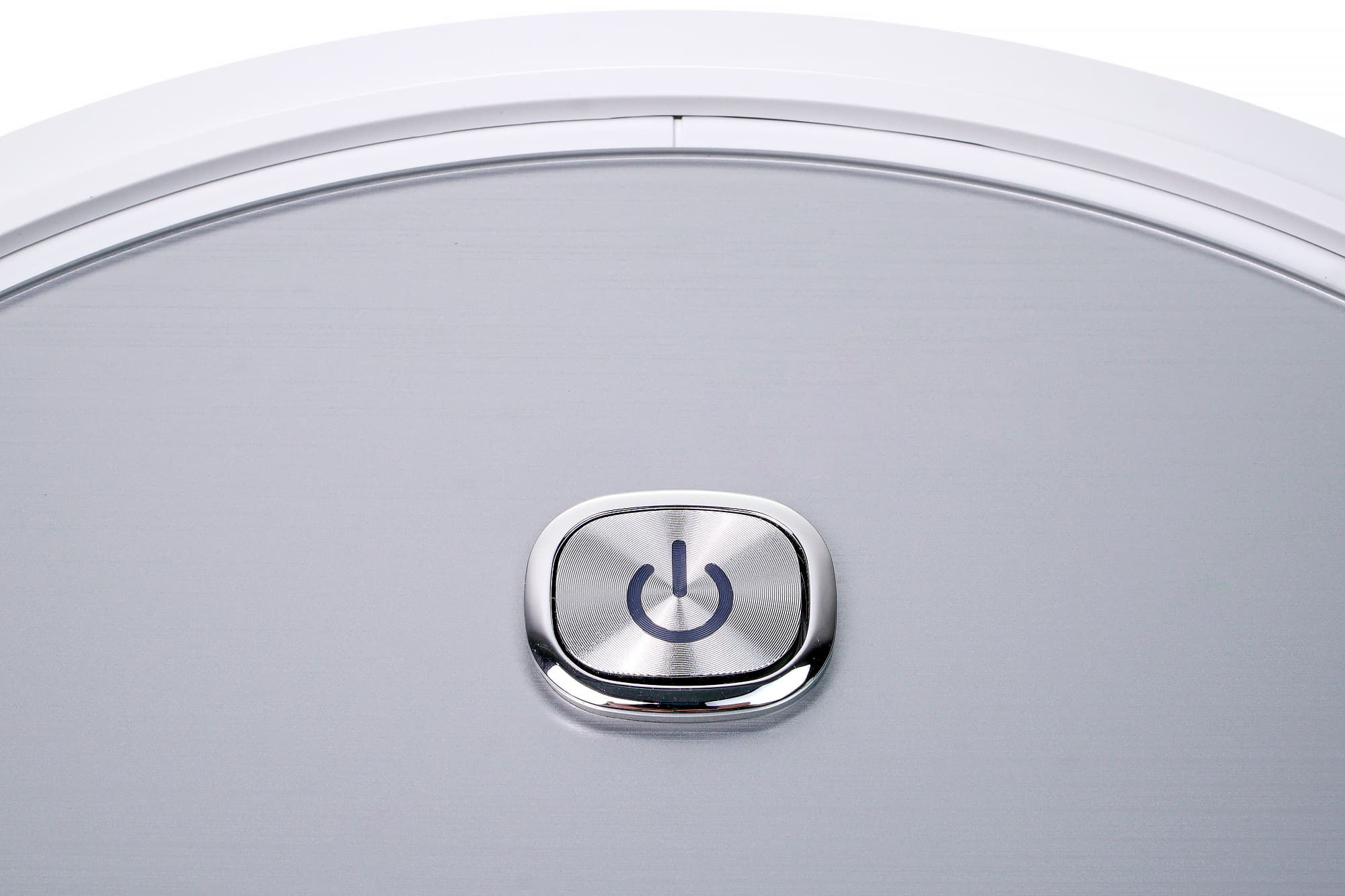 При взгляде сверху робот-пылесос Polaris PVCR-1226 выглядит строго, если не сказать — аскетично. На верхней стеклянной панели выделяется единственная кнопка управления, чуть ниже размещен логотип производителя. Под панелью находится серебристая матовая подложка, дающая небольшой зеркальный эффект.