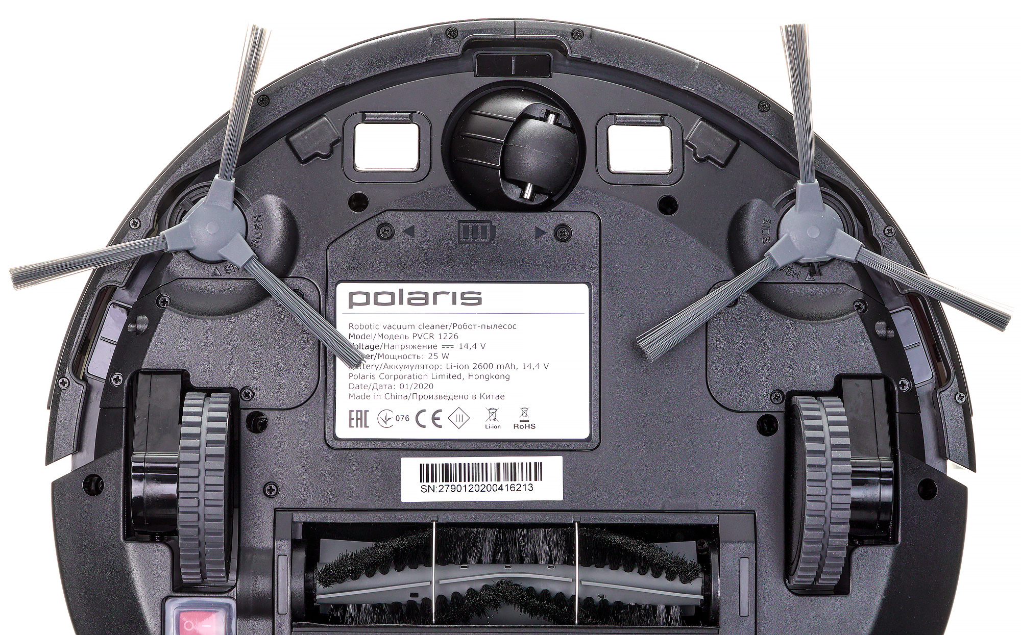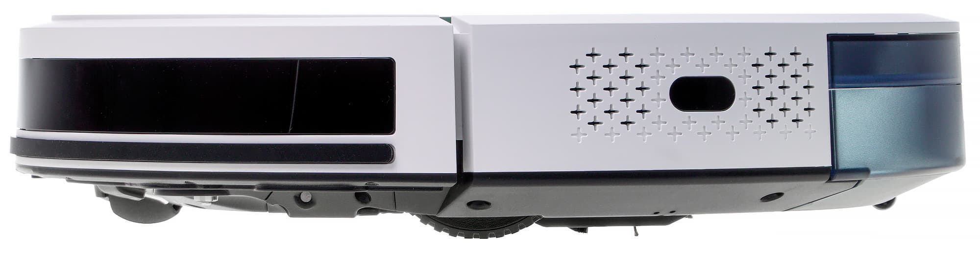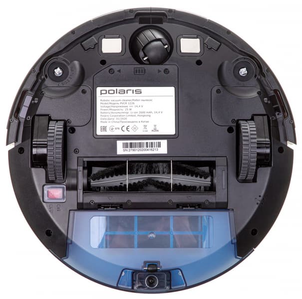 У направляющего колеса — гладкий резиновый протектор. Оно заключено в пластиковую сферу, позволяющую вращаться на 360°. По обе стороны от колеса размещаются контакты для зарядки на базе. В передней части корпуса есть гнезда для крепления боковых щеток, а рядом с ними и по бокам — окошки оптических (инфракрасных) датчиков поверхности.