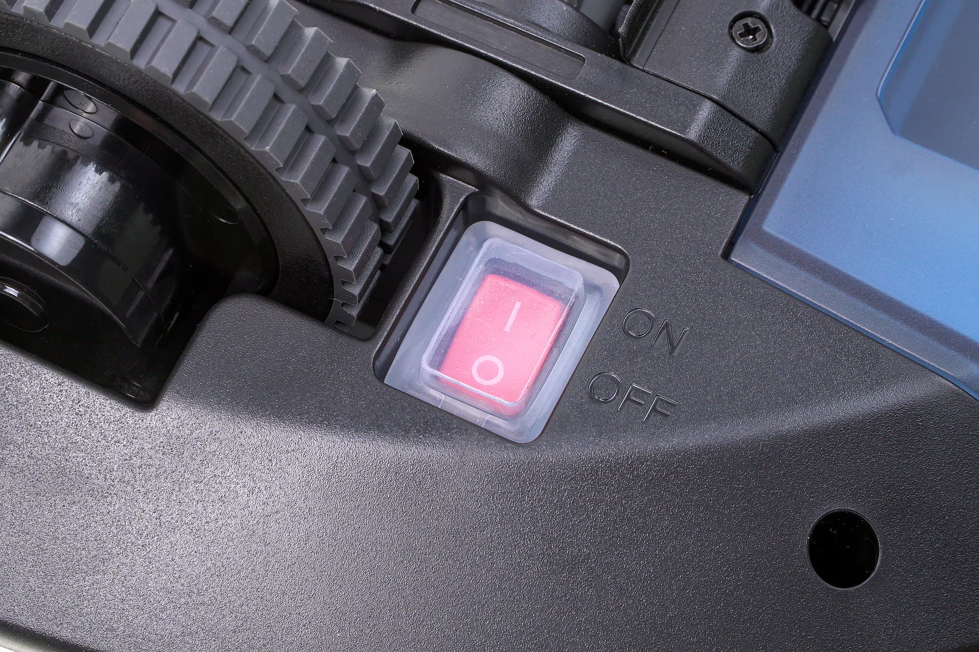 За левым ведущим колесом размещается выключатель устройства, закрытый герметичным силиконовым колпачком. За правым — решетка динамика.