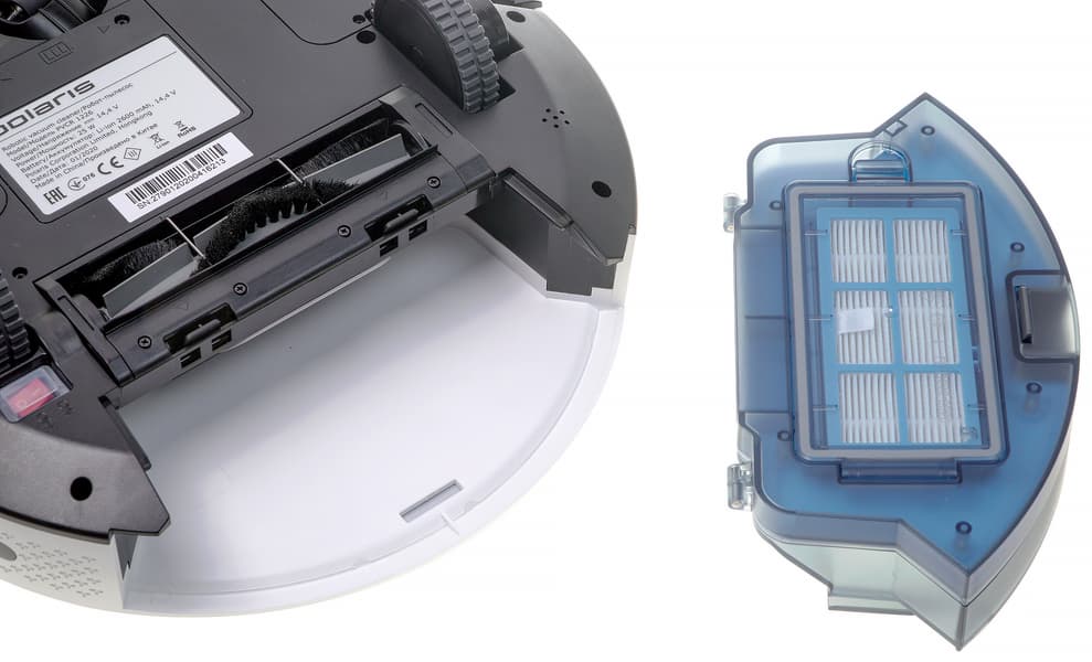Верхняя часть модуля сухой уборки может полностью открываться для опорожнения пылесборника. В ее крышке размещается прямоугольный фильтр тонкой очистки, состоящий из предварительного поролонового и HEPA-элемента. Этот блок извлекается из отсека при помощи тканевого язычка.