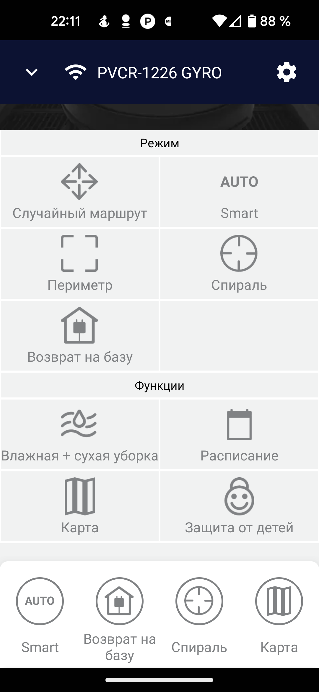 На главной странице приложения находится виртуальный пульт. С его помощью можно управлять движением подключенного пылесоса, приостанавливать текущую уборку и запускать ее. В нижней части экрана расположены кнопки опций уборки.