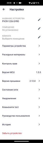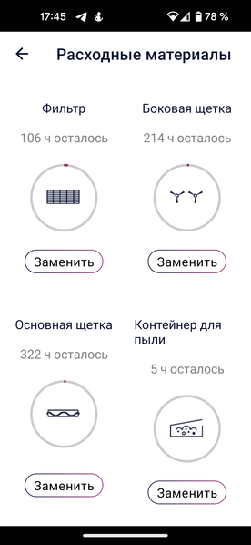 В разделе настроек можно передать права на управление пылесосом другим пользователям, у которых установлено приложение. Здесь же можно проверить и обновить версию встроенного программного обеспечения, прочитать документацию, ознакомиться с историей уборок и уточнить оставшийся ресурс расходных материалов.