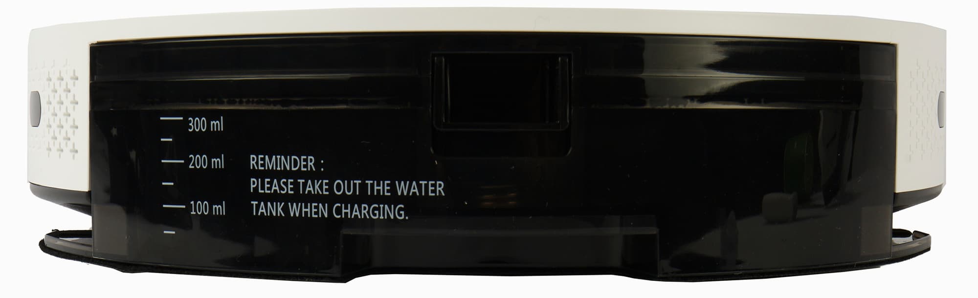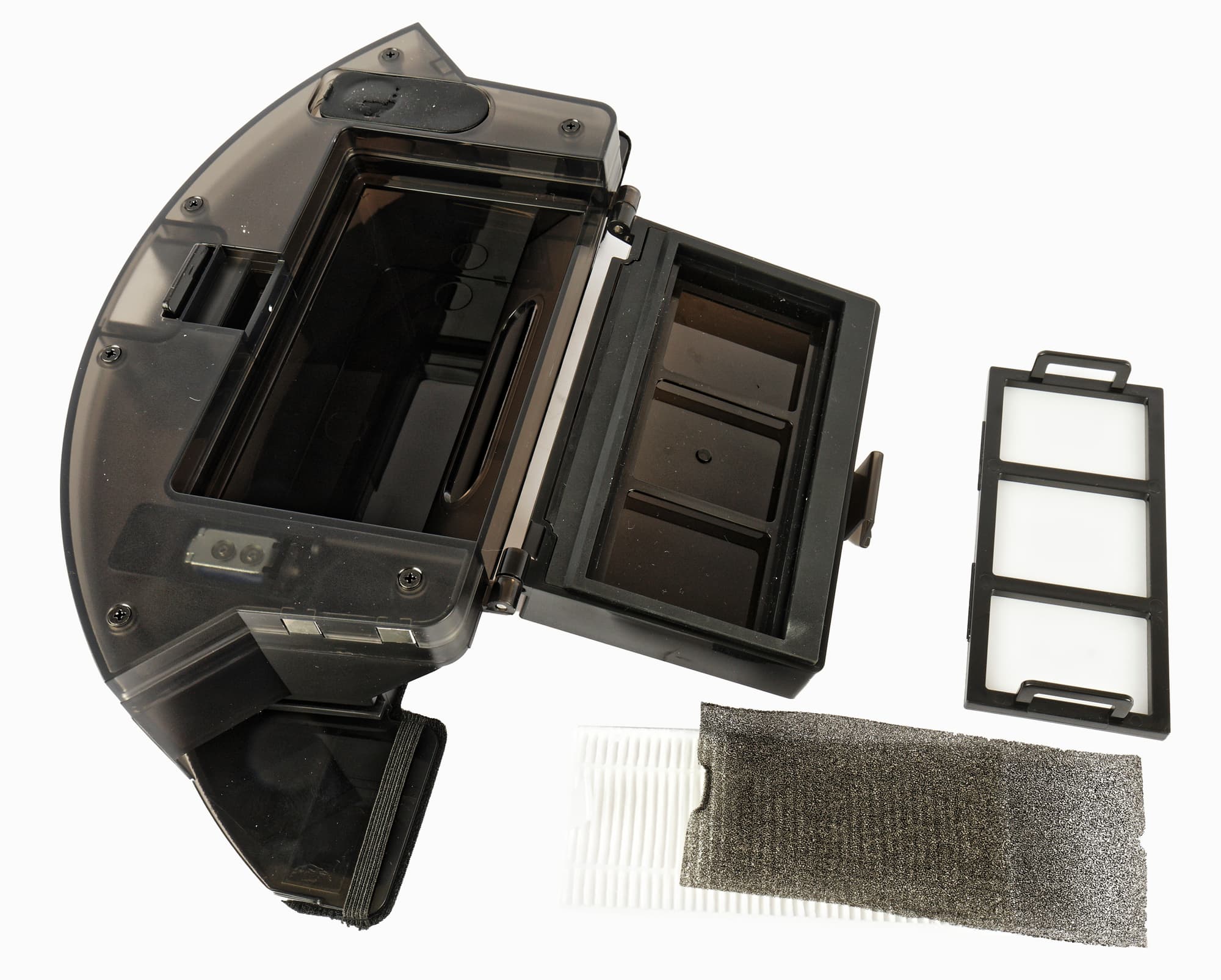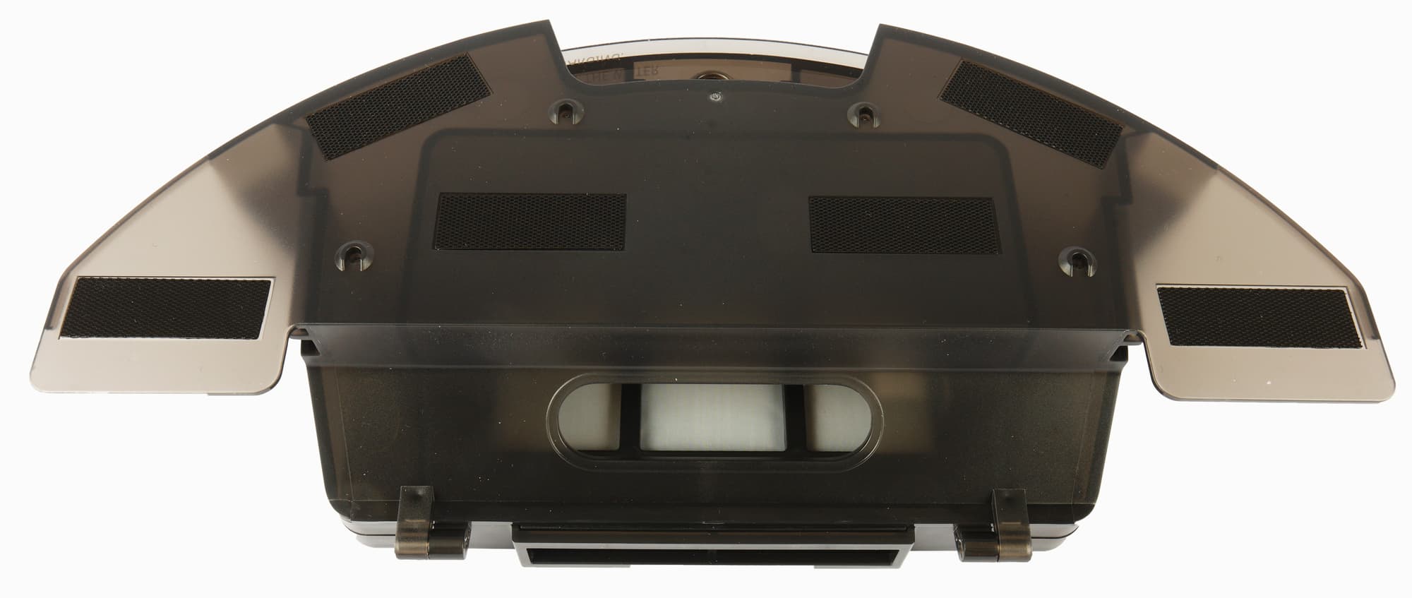 Блок для сухой и влажной уборки закрепляется в отсеке в задней части корпуса. Он состоит из мусоросборника с системой фильтров, резервуара для воды и рамки, на которой крепится микрофибровая тряпка для мытья пола.