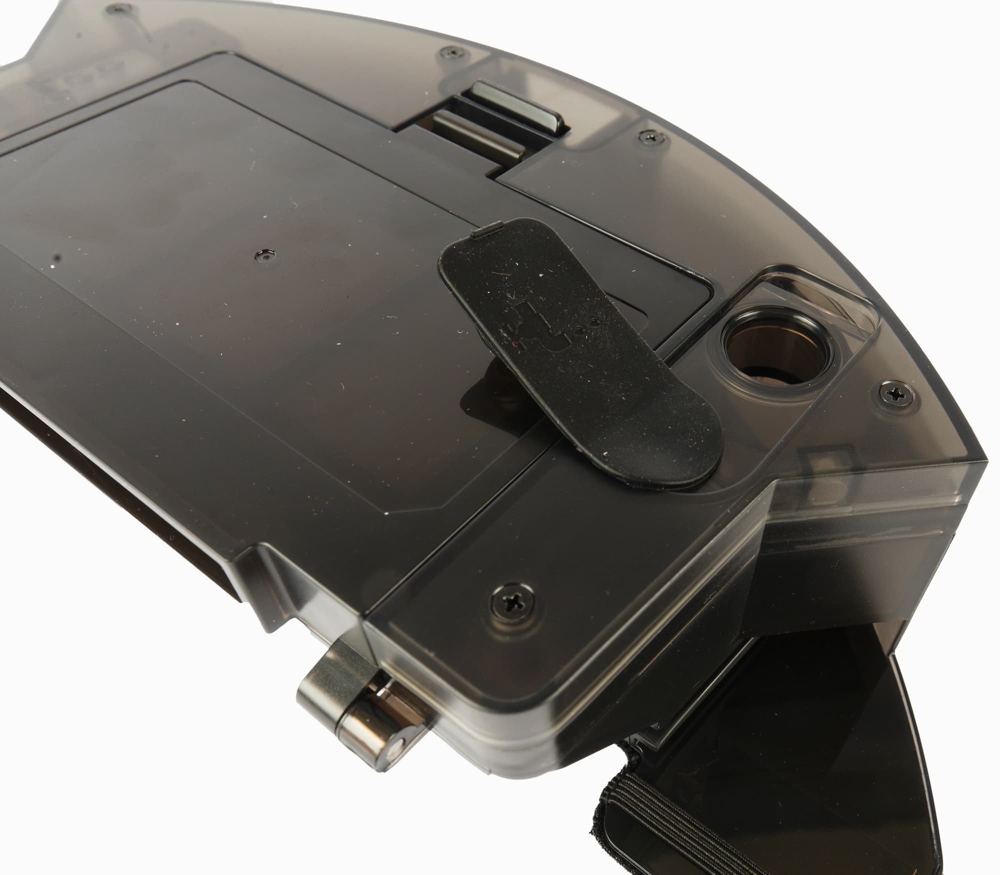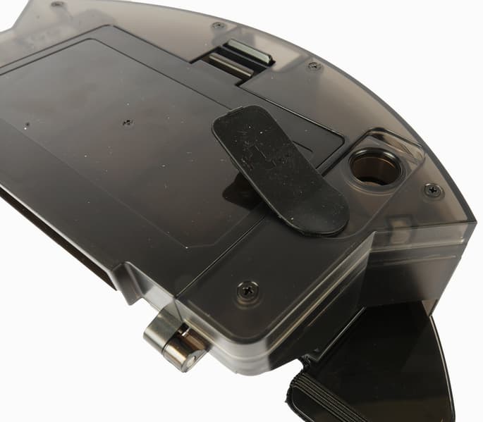 Крышка мусоросборника удерживается защелкой и откидывается более чем на 180° — это облегчает опорожнение резервуара. Система фильтрации состоит из капроновой сетки, натянутой на пластиковую рамку, поролонового элемента и прямоугольного HEPA-фильтра.