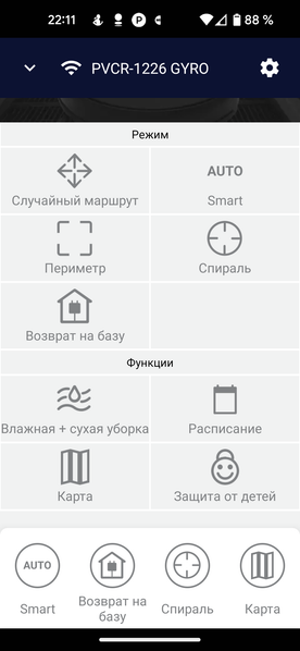 При мытье полов робот оставляет за собой равномерно влажный быстросохнущий след без разводов, капель и подтеков. Не надо только оставлять его на зарядке с модулем влажной уборки, чтобы не испортить покрытие под ней. Настроить протирку полов по расписанию у PVCR 1226 (как, впрочем, и у большинства его собратьев) нельзя.