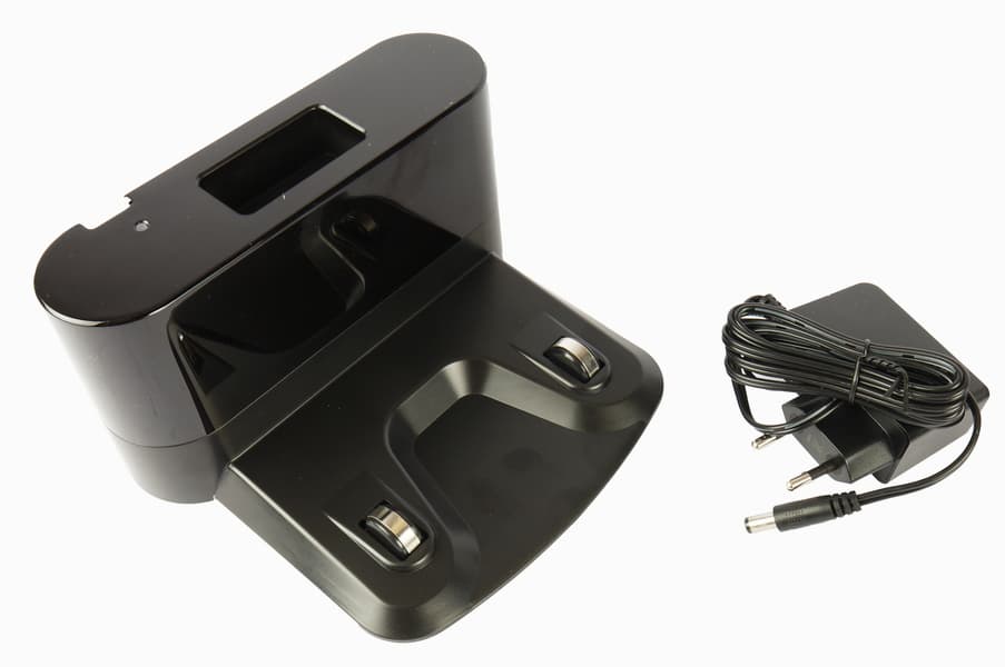 Верхняя часть базы выполнена из ИК-прозрачного пластика. Под ним располагаются датчики, облегчающие позиционирование пылесоса при поиске зарядной станции. В верхней части базы —светодиод, сигнализирующий о ходе зарядки аккумулятора. Рядом с ним находится отсек для пульта дистанционного управления, но в комплекте PVCR 1226 такового нет: производитель использует типовую конструкцию корпуса базы для нескольких моделей.