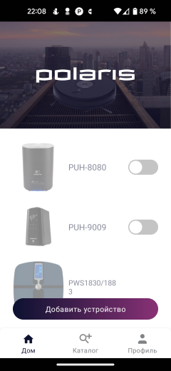 Чтобы начать работу, программа требует создать аккаунт с верифицированным номером мобильного телефона и запрашивает сведения о местоположении устройства. После входа на главном экране мы видим уже настроенные нами ранее приборы из линейки IQ Home и кнопку «Добавить устройство».
