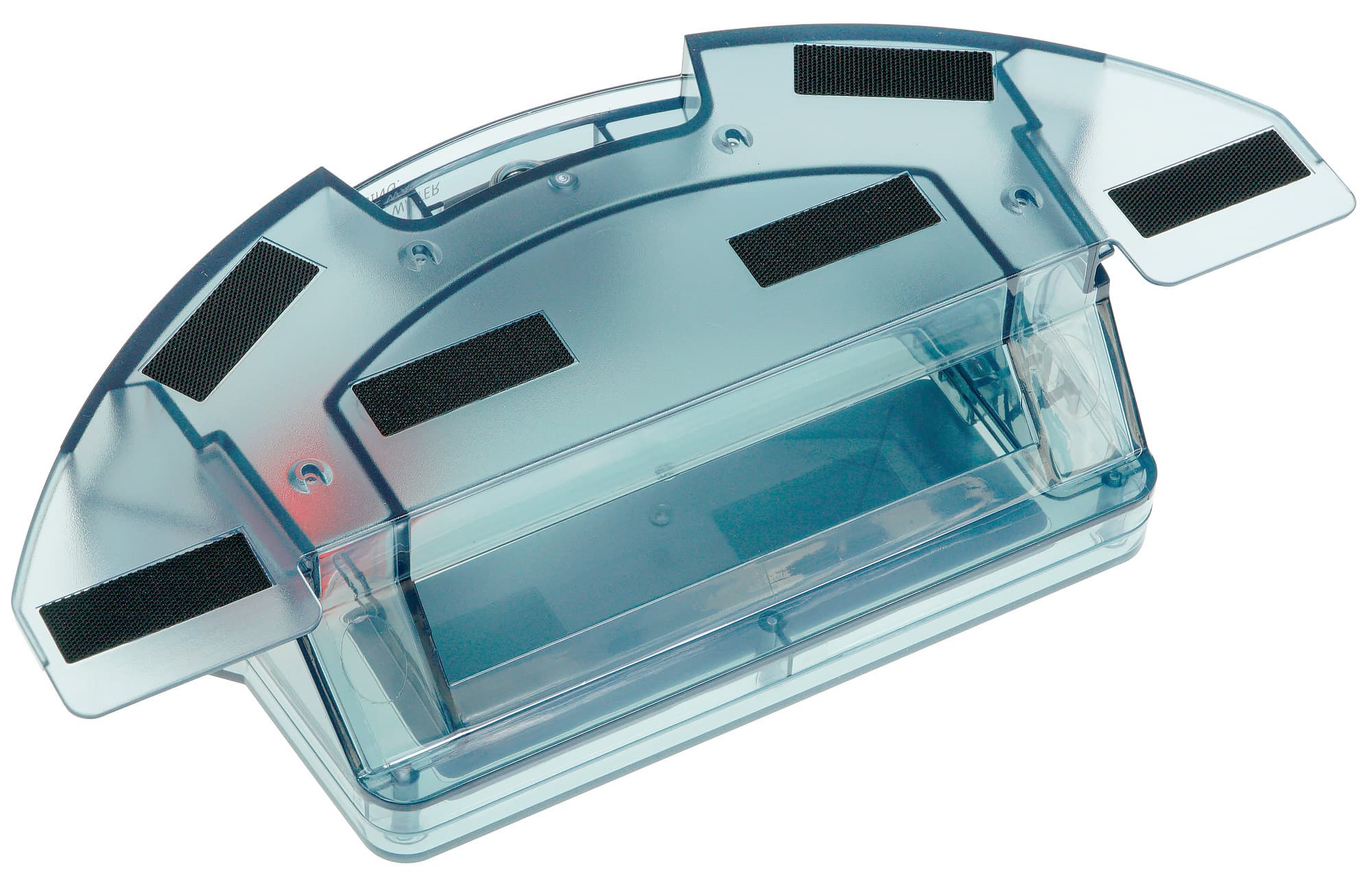 Модуль для влажной уборки имеет отсек для сбора пыли и мусора, а также контейнер для воды. На своем месте модуль также фиксируется с помощью защелки-кнопки. Отверстие для наполнения находится на верхней панели вставки и закрыто резиновой пробкой. На боковой стенке модуля для влажной уборки можно увидеть градуировку от 50 до 300 мл с шагом в 50 мл, а также напоминание о том, что заряжать прибор следует со снятым контейнером для воды.