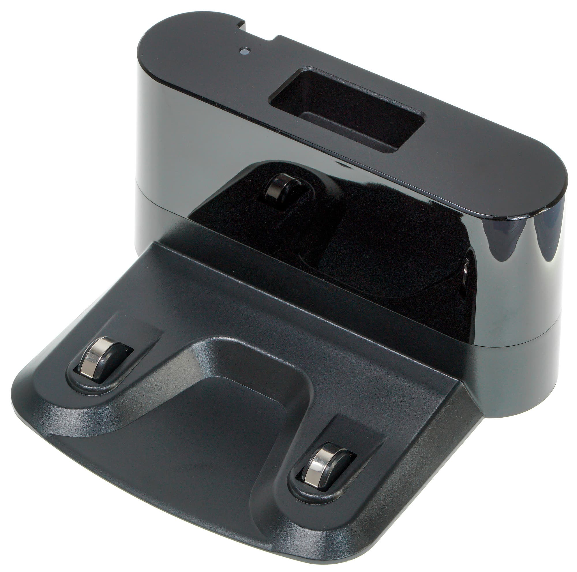 Верхняя часть пластиковой базы выполнена из ИК-прозрачного пластика, под которым стоят датчики, обеспечивающие позиционирование робота при возвращении на зарядку. У базы есть светодиод, сигнализирующий о ходе заряда батареи. Контакты подпружинены и имеют ход около 3 мм.