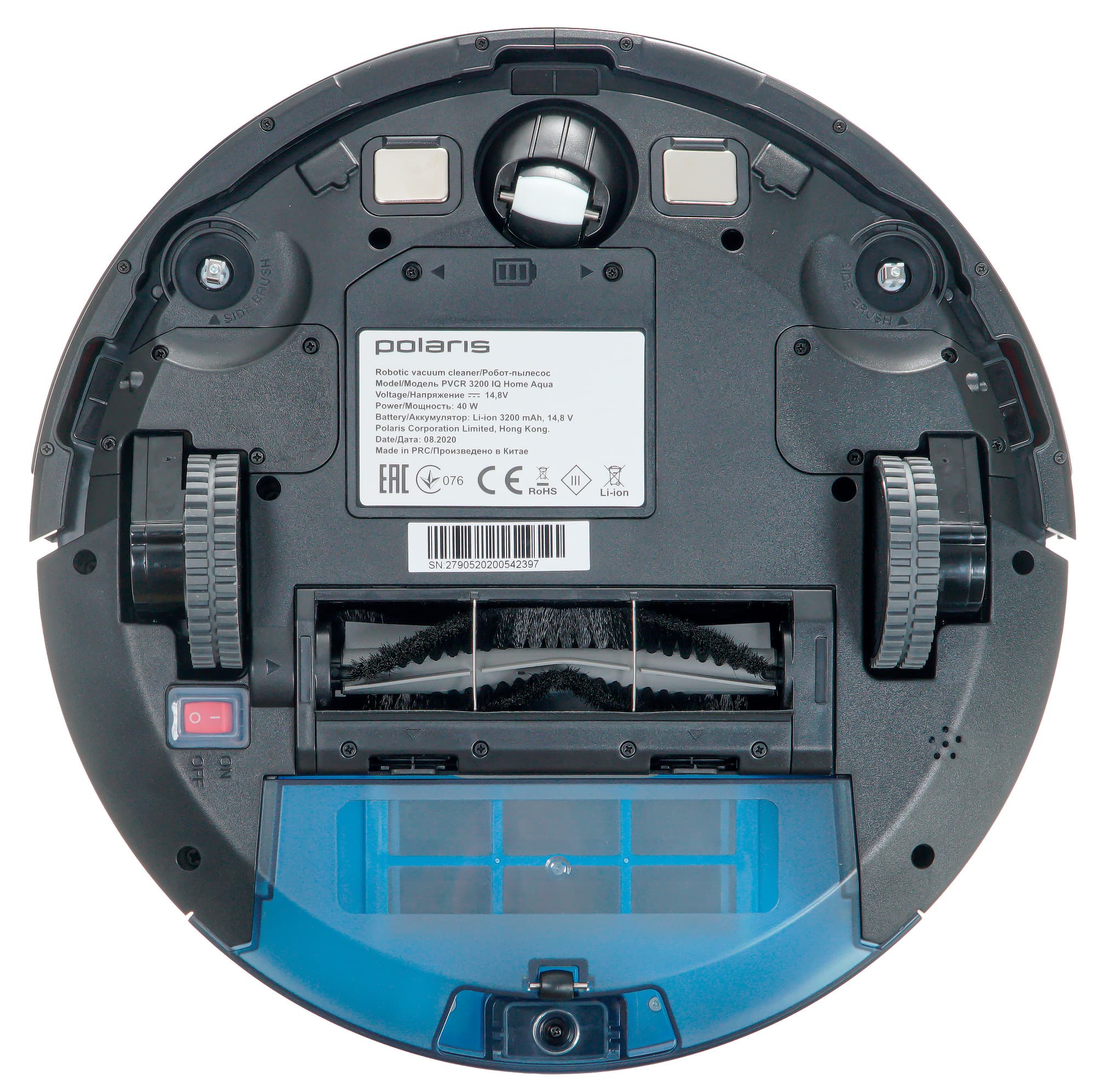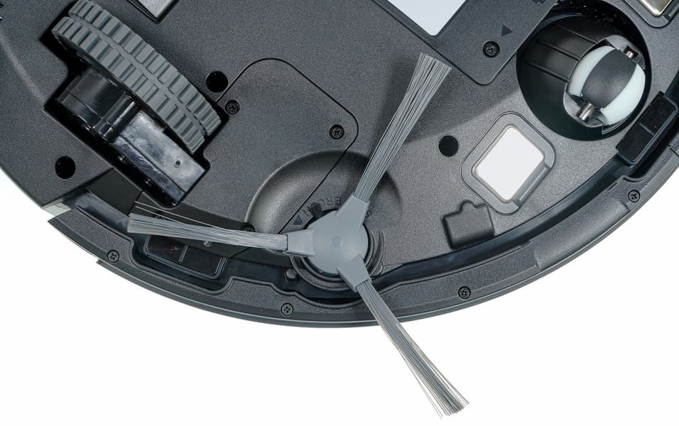 Направляющее колесо пластиковое. Оно заключено в пластиковую же сферу, допускающую свободное вращение на 360°. По обе стороны от колеса размещаются контакты для зарядки на базе. Также в передней части корпуса можно увидеть гнезда для крепления боковых щеток, а по центру и по бокам — окошки оптических (инфракрасных) датчиков поверхности.